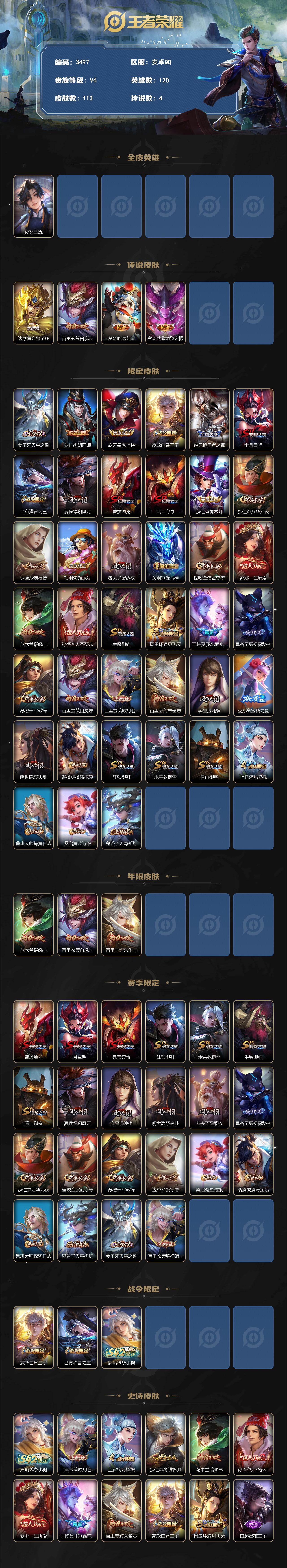 安卓Q-V6-永恒钻石I段位-120英雄-113皮肤-4传说-25史诗