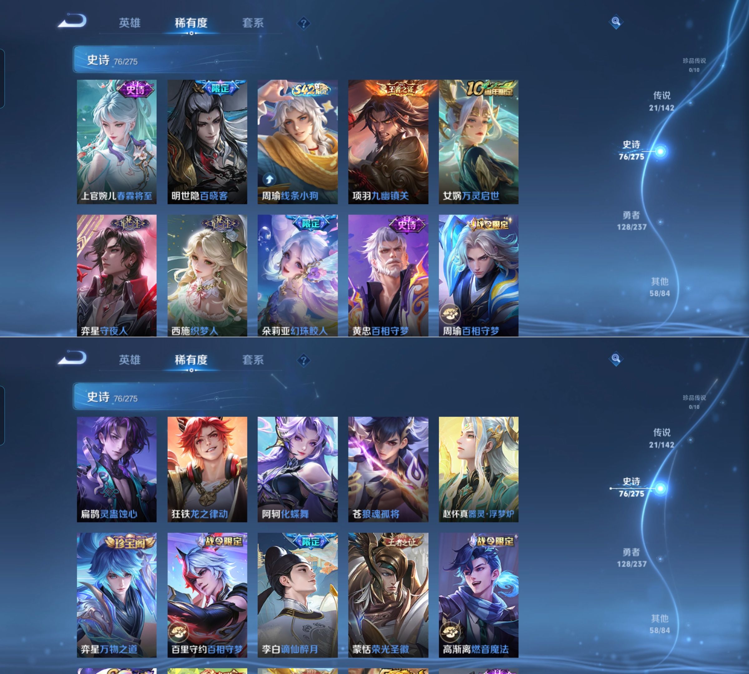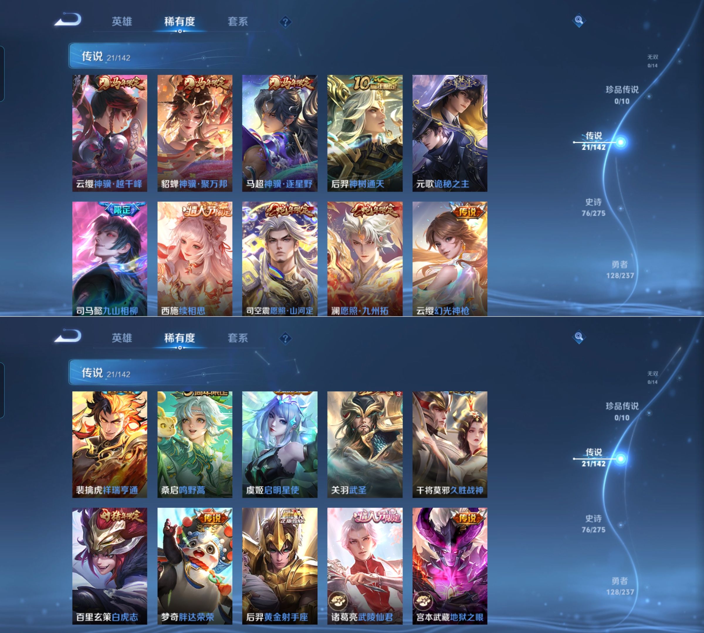 【传说皮肤】 诡秘之主 神树通天 鸣野蒿 神骥·聚万邦 神骥·逐星野 神骥·越千峰 九山相柳 续相思 幻光神枪 愿照·山河定 祥瑞亨通 愿照·九州拓 白虎志 久胜战神 地狱之眼 武圣 黄金射手座 胖达荣荣 地狱火 启明星使 武陵仙君