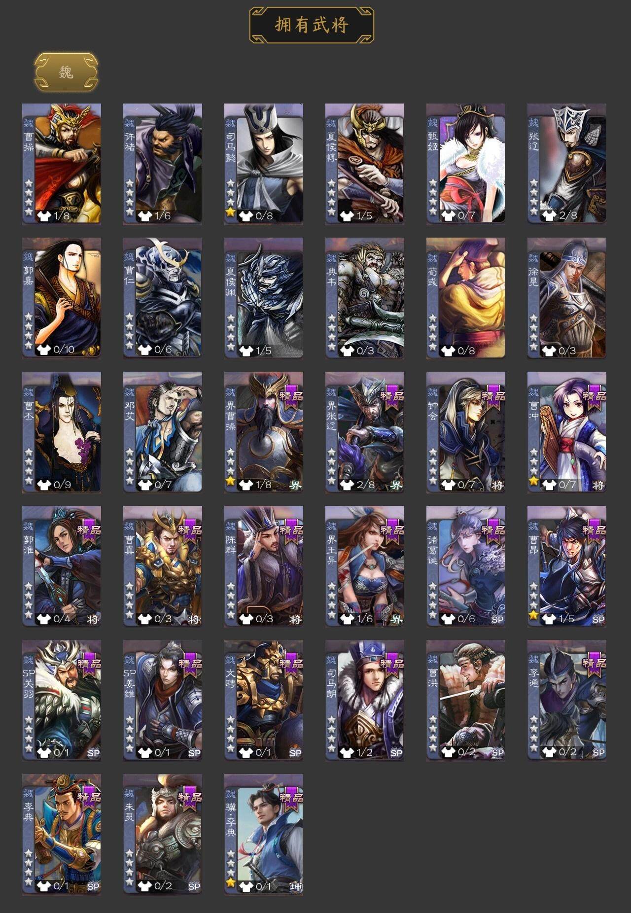 SP关羽,曹昂,诸葛诞,朱灵,文聘,SP姜维,钟会,曹冲,郭淮,界王异,界曹操,界张辽,李典,曹真,陈群,司马朗,李通,马良,界马岱,界法正,界关兴张苞,界刘备,界赵云,SP徐庶,周仓,