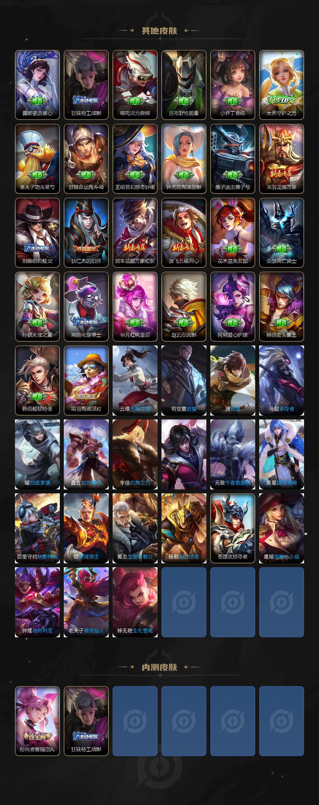 【限定皮肤】:暃埋骨钱,蒙犽顽岩魄,姜子牙天穹之誓,狄仁杰阴阳师,赵云皇家上将,孙尚香蔷薇恋人,马可波罗山海玄木吟,狄仁杰魔术师,项羽海滩派对,兰陵王金庭之子,孙悟空齐天大圣,李元芳云中旅人,沈梦溪大漠名商,裴擒虎擒涛扼浪,鲁班大师探海日志,桑启海盐诗旅,张良古海寻踪,鬼谷子天穹祈灯,百里玄策超元猎域,刘邦剑破天穹,程咬