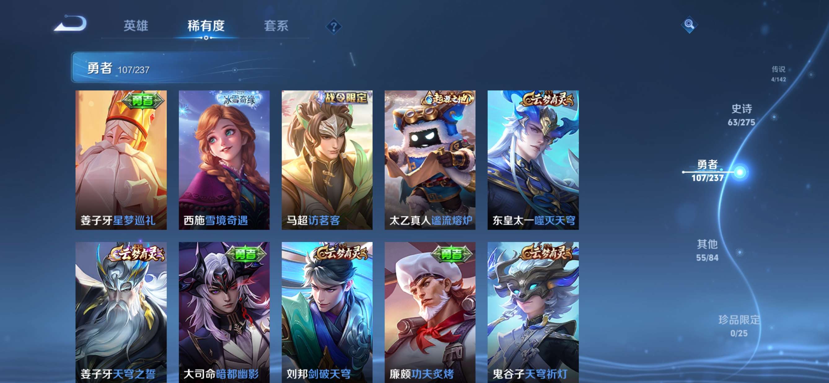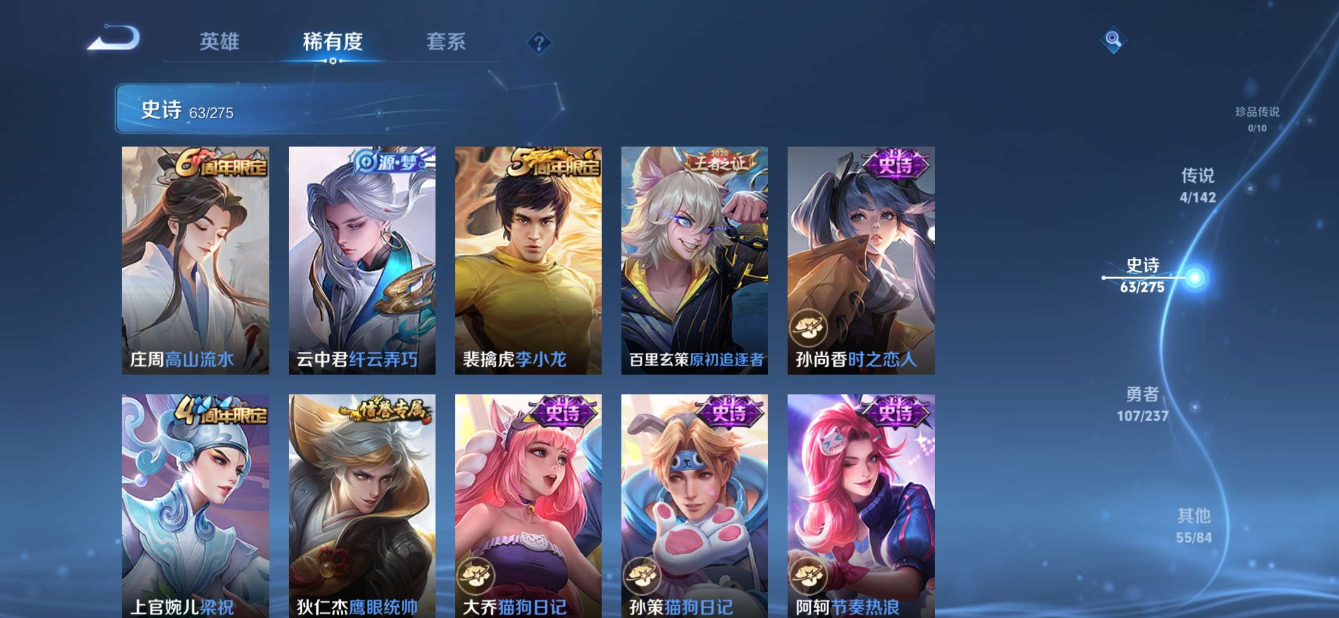 【史诗皮肤】 蔬乡物语 破空之剑 茶境仙 器灵·浮梦炉 布丁狗之约 谧流熔炉 鸭鸭历险记 龙之律动 线条小狗 九幽镇关 山海·玄木吟 踏浪烽翎 荣光圣徽 百相守梦 雪豹·霜爪 万灵启世 顽趣 幽灵船长 拒霜思 功夫厨神 女仆咖啡 猫狗日记 魔术师 鹰眼统帅 圣诞恋歌 鬼剑武藏 白龙吟 水晶猎