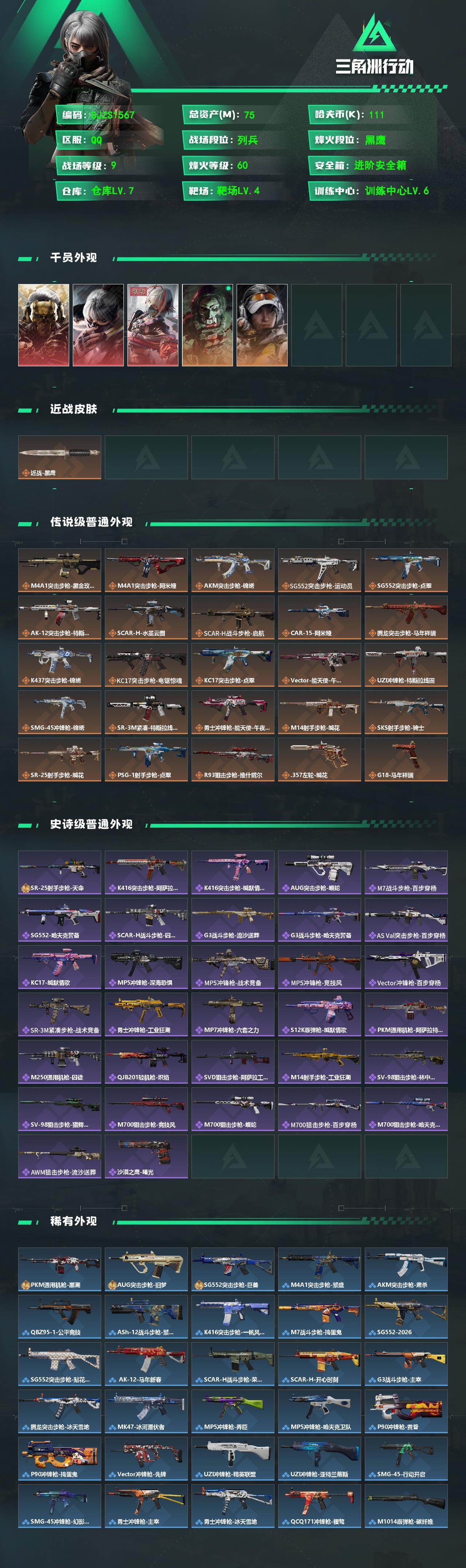 【SJZS1567】总资产(M):75M/哈夫币(K):111K/哈夫币(K):111K/传说枪皮数:25/全面战场等级:9_段位:列兵/烽火地带等级:60_段位:黑鹰/红狼-蚀金玫瑰/骇爪-水墨云图/骇爪-维什戴尔/红狼-电锯惊魂/露娜-金牌射手/近战-黑鹰/M4A1突击步枪-蚀金玫瑰/M4A1突击步枪-阿米娅/AKM突击步枪-锦绣/SG552突击步枪-运动员/SG552突击步枪-点翠/AK-12突击步枪-特斯拉线圈/SCAR-H战斗步枪-水墨云图/SCAR-H战斗步枪-启航/CAR-15突击