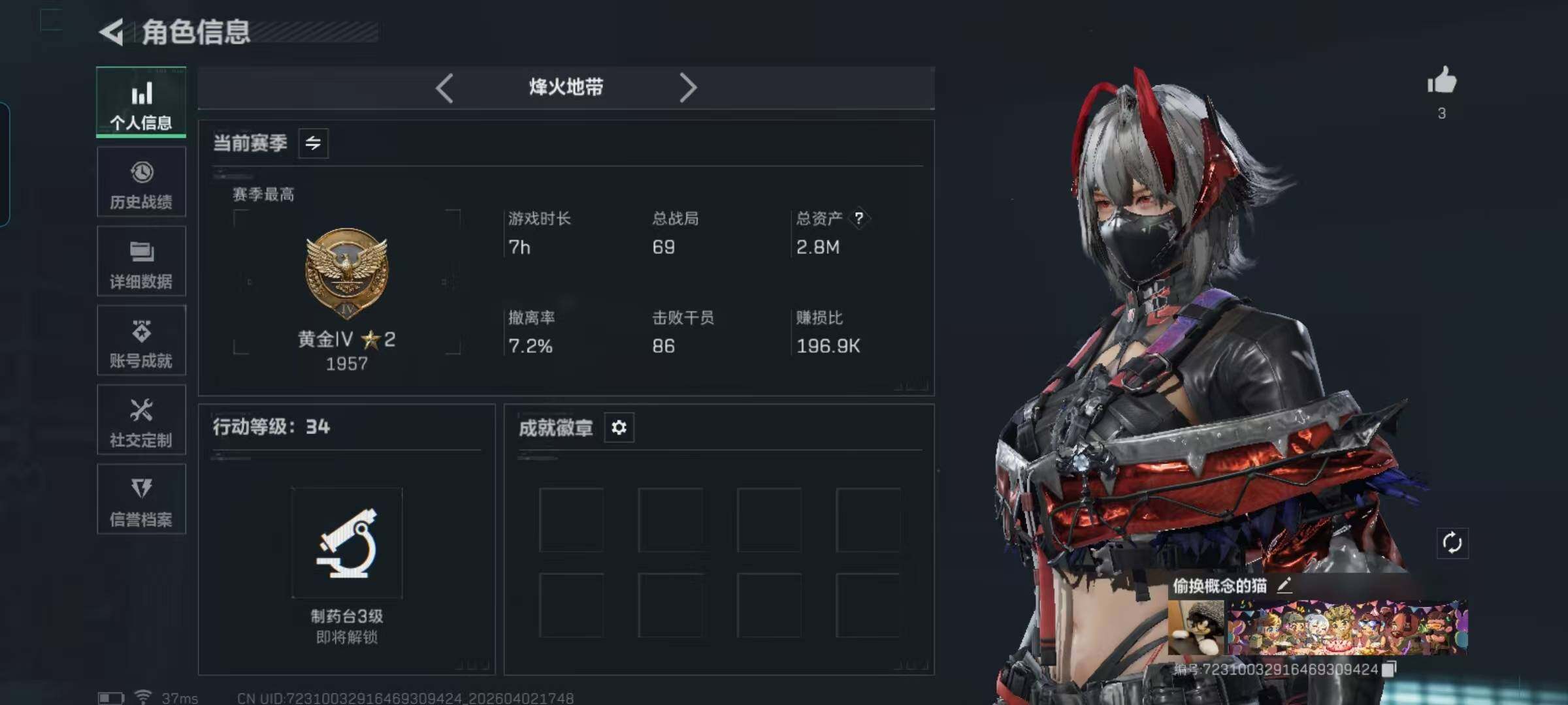 总资产(M):2M/哈夫币(K):257K/传说枪皮数:10/全面战场等级:23_段位:军士长/烽火地带等级:34_段位:黄金/