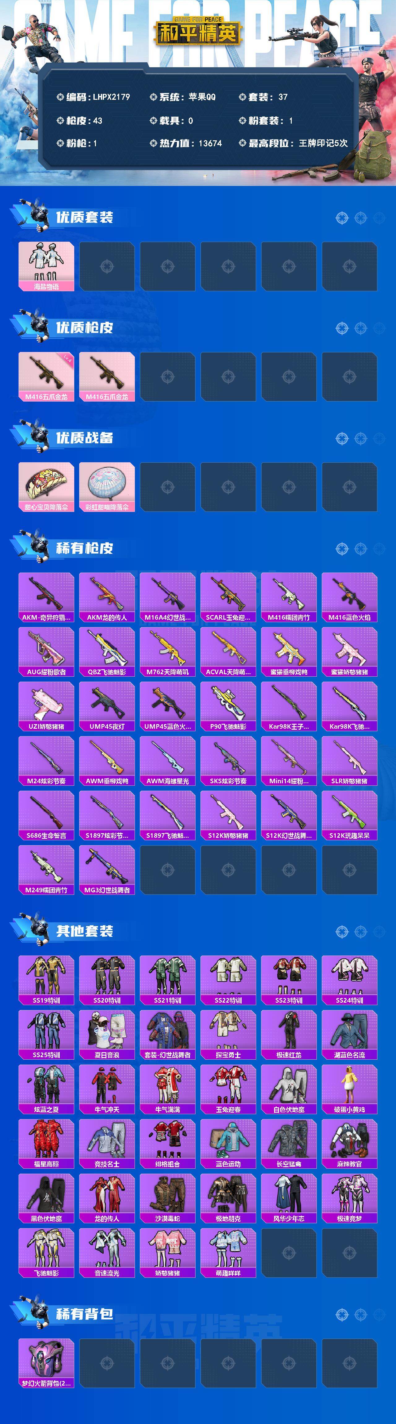 可二次【特价出售/店主推荐】苹果 手Q-1粉装-1特效枪-13674热力值-5王牌印记-37套装-43枪皮【粉色套装】:粉装-海盐物语【粉色枪皮等级】:M416-五爪金龙(四级)