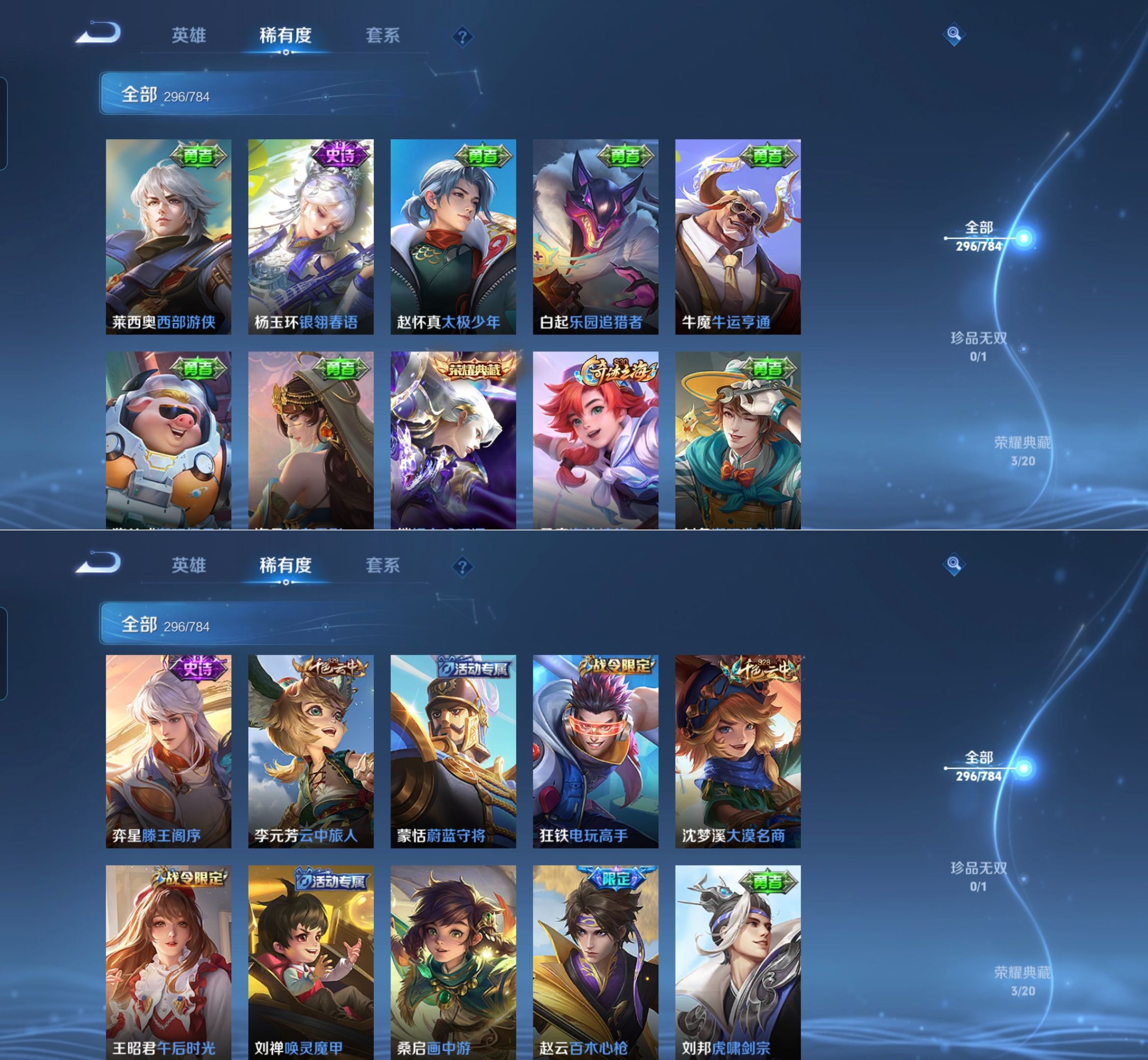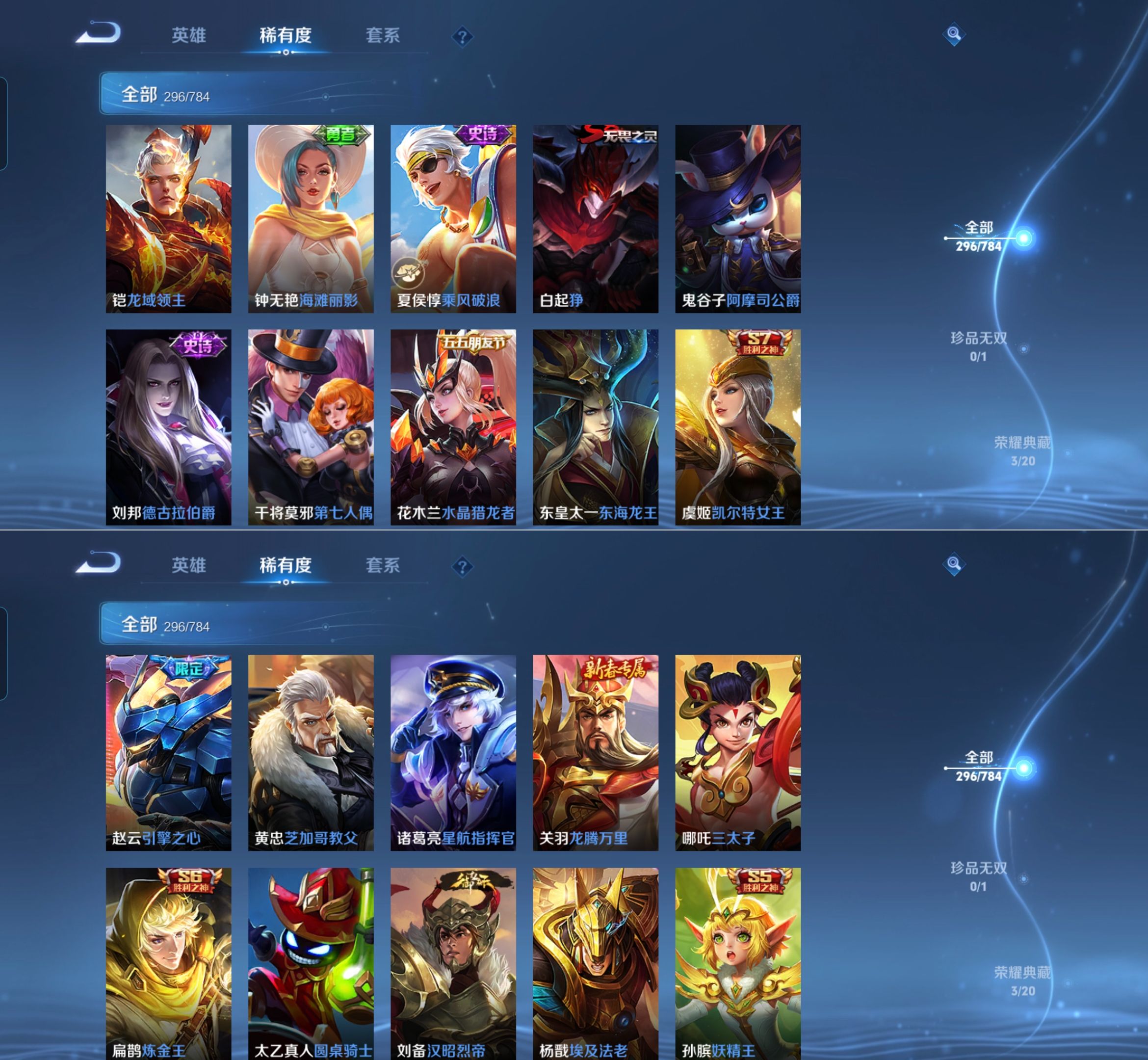 【传说皮肤】 星之鸣奏 鸣野蒿 逐花归海 琥珀纪元 战鼓燎原 祥瑞亨通 愿照·九州拓 超时空战士 太华 地狱之眼 永曜之星 云鹰飞将 云霓雀翎 启明星使 淬星耀世