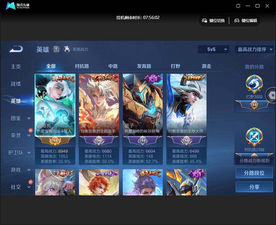 【W6413】【打野38段号-诸葛亮省标-张良省标-2.7k星币】营地ID:【爆款臻稀皮肤:星域神启-马超琥珀纪元-愿照九州拓-山海炽霜斩-山海苍雷引-时雨天司-鹤羽星尊-逐花归海-无双飞将-飞衡-幻光神枪-黄金白羊座-神树通天-鸣野蒿】可二次-贵7-125英雄-245皮肤-1典藏-1星元-13传说-12按键-贵族积分4.1w
