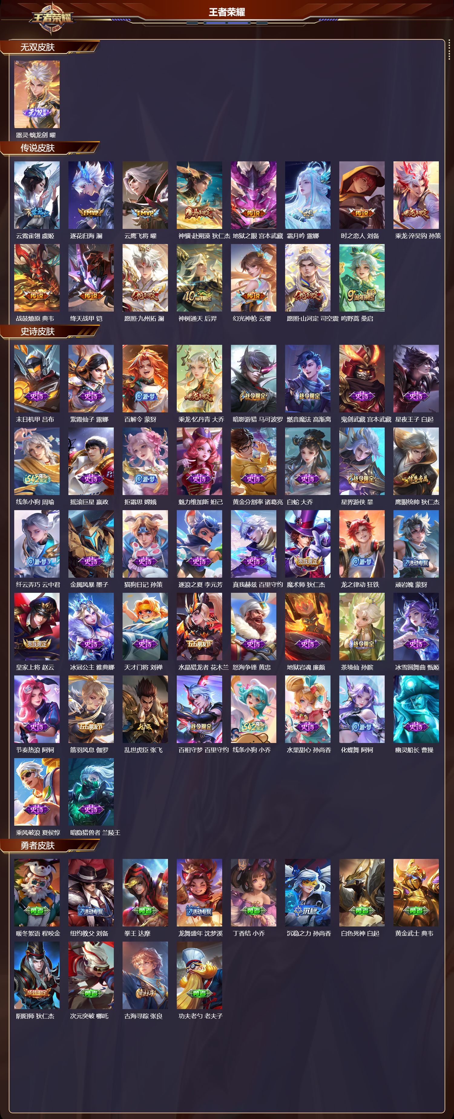 最强王者/151皮肤/126英雄/0典藏/0珍品无双/1无双/0珍品传说/15传说/42史诗/7稀有英雄