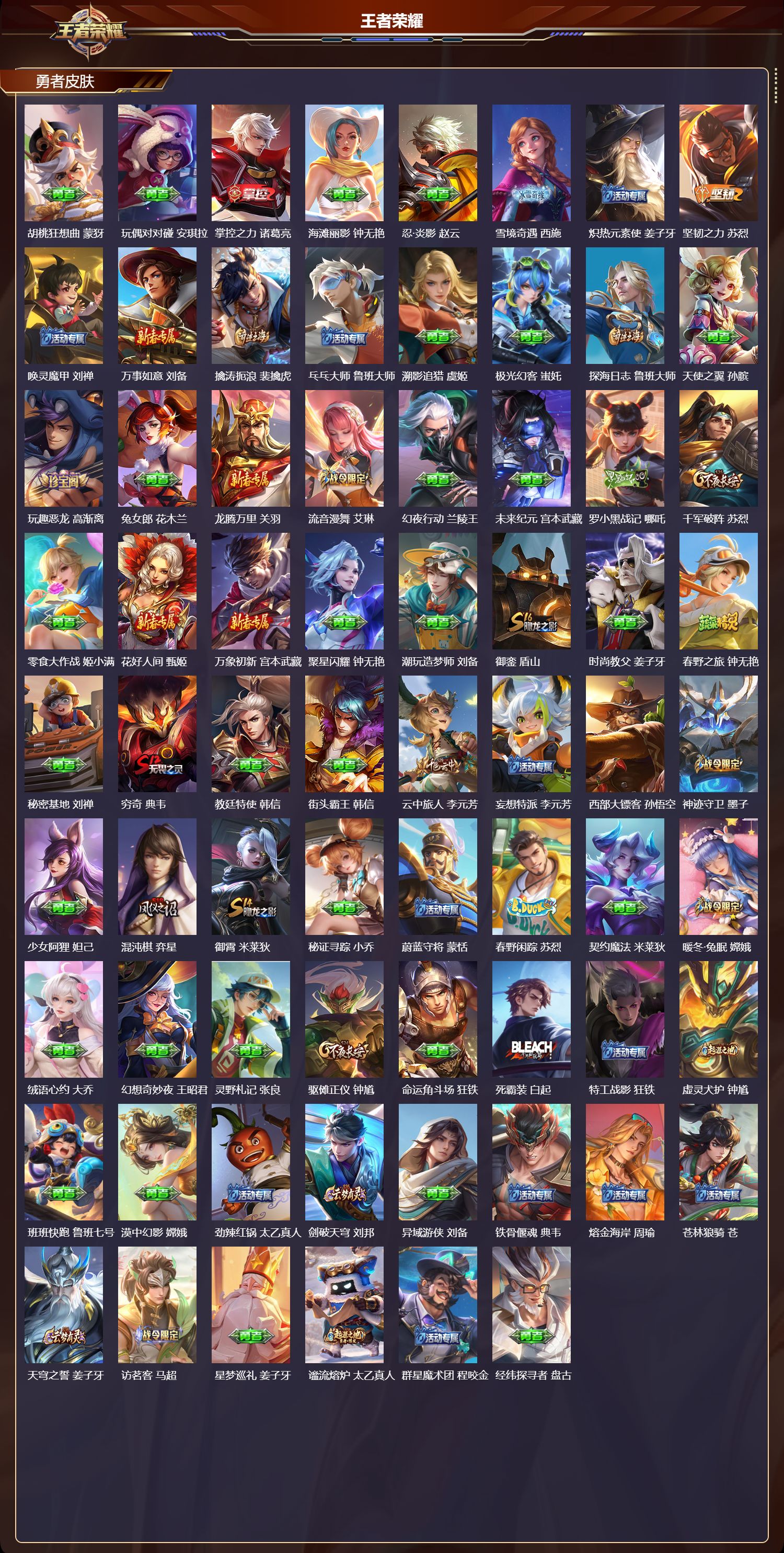 荣耀王者/258皮肤/128英雄/0典藏/0珍品无双/2无双/0珍品传说/18传说/64史诗/9稀有英雄