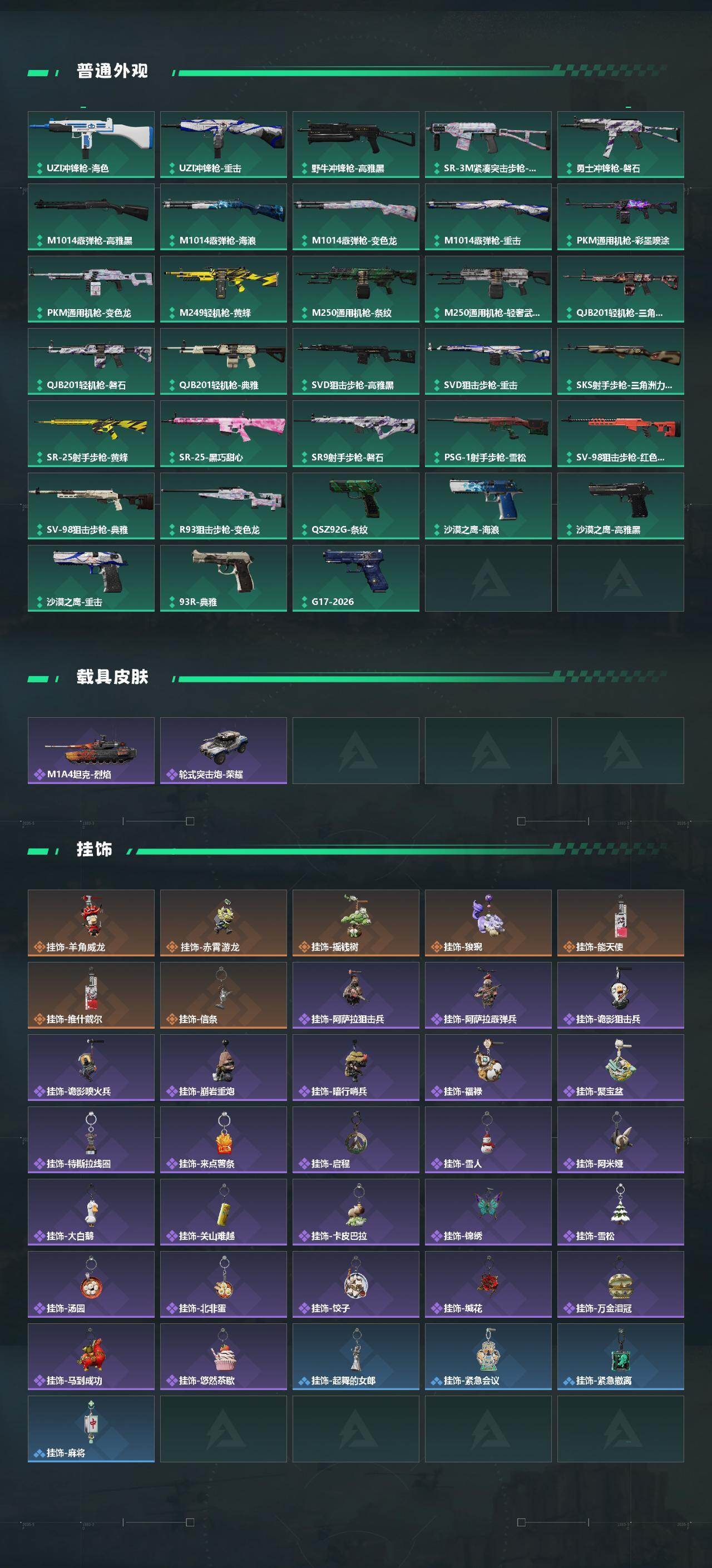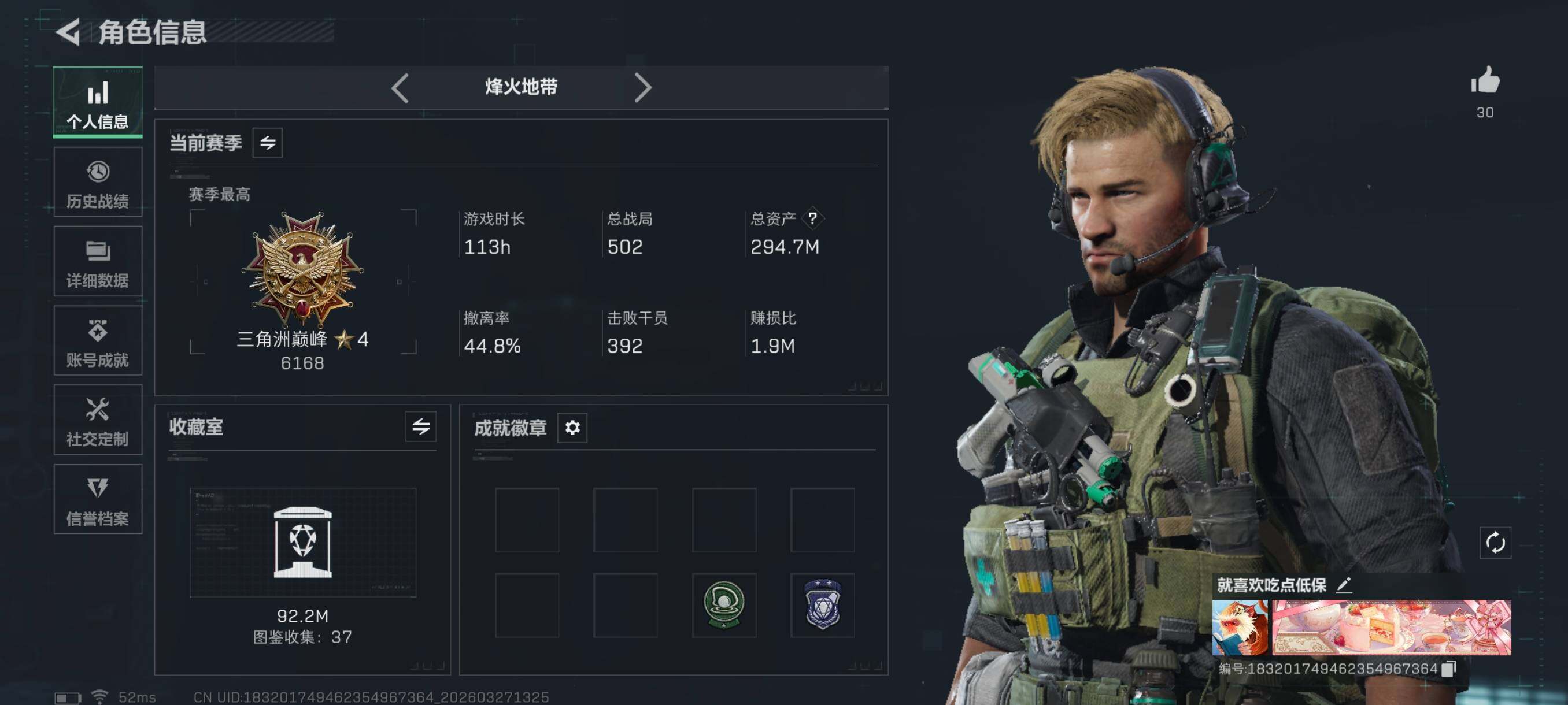总资产294M/哈夫币382万/传说近战数1/传说枪皮数36/战场等级1/行动等级60/安全箱等时效性道具以游戏内数据为准,详情请看图/蛊-能天使·午夜邮差/红狼-电锯惊魂/露娜-金牌射手/乌鲁鲁-荒原猎手/近战-信条/近战-黑鹰/M4A1突击步枪-阿米娅/AKM突击步枪-锦绣/ASh-12战斗步枪-鹅鸭杀/AUG突击步枪-悠然茶歇/SG552突击步枪-运动员/AK-12突击步枪-特斯拉线圈/
