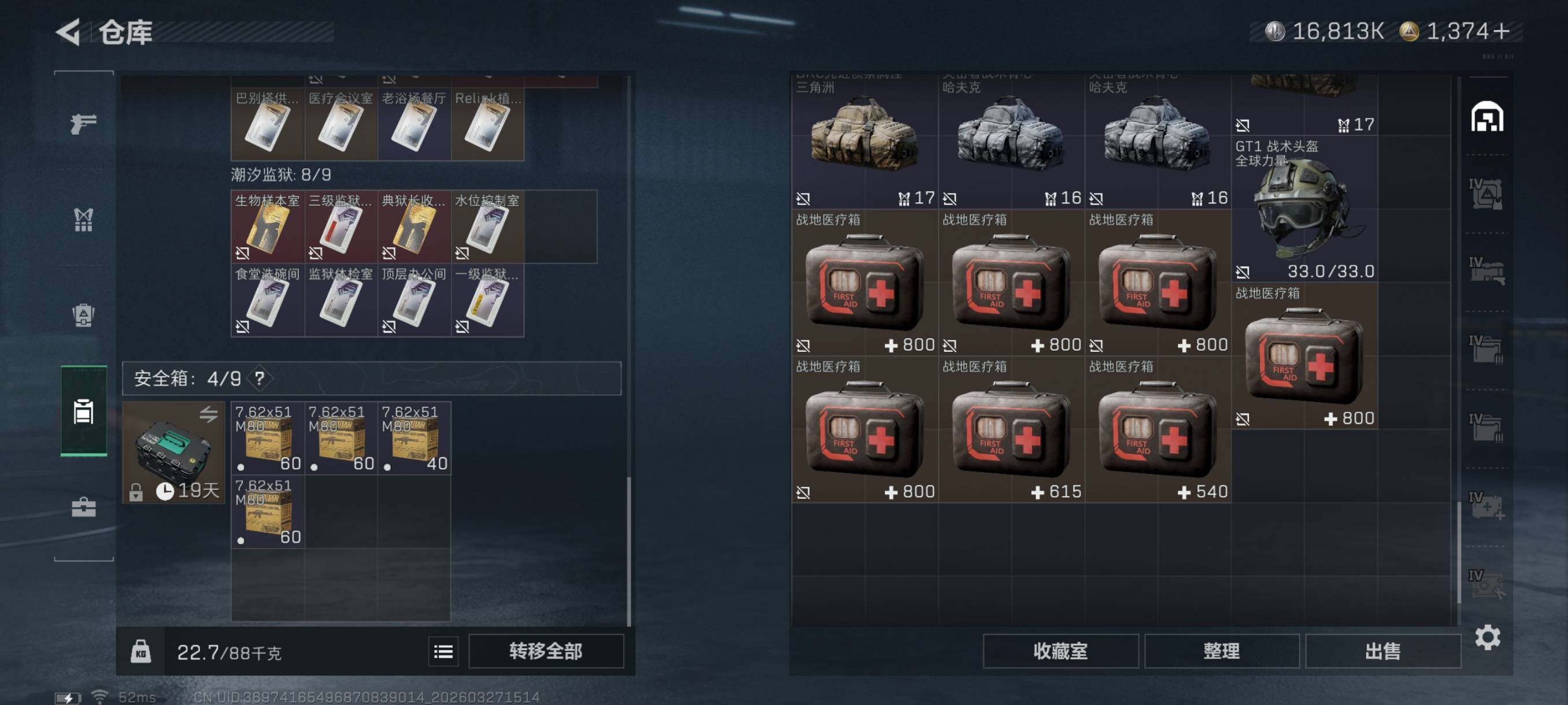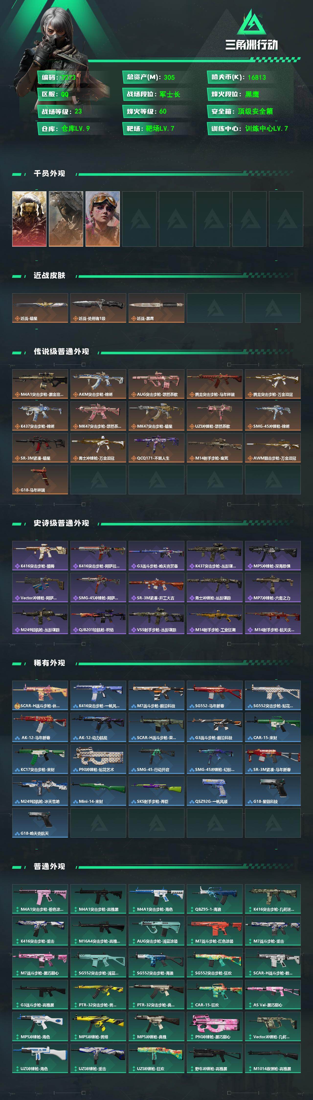 总资产305M/哈夫币1681万/传说近战数1/传说枪皮数16/战场等级23/行动等级60/安全箱等时效性道具以游戏内数据为准,详情请看图/红狼-蚀金玫瑰/乌鲁鲁-荒原猎手/蛊-不羁人生/近战-暗星/近战-处刑者/近战-黑鹰/M4A1突击步枪-蚀金玫瑰/AKM突击步枪-锦绣/AUG突击步枪-悠然茶歇/腾龙突击步枪-马年祥瑞/腾龙突击步枪-万金泪冠/K437突击步枪-锦绣/MK47突击步枪-悠然