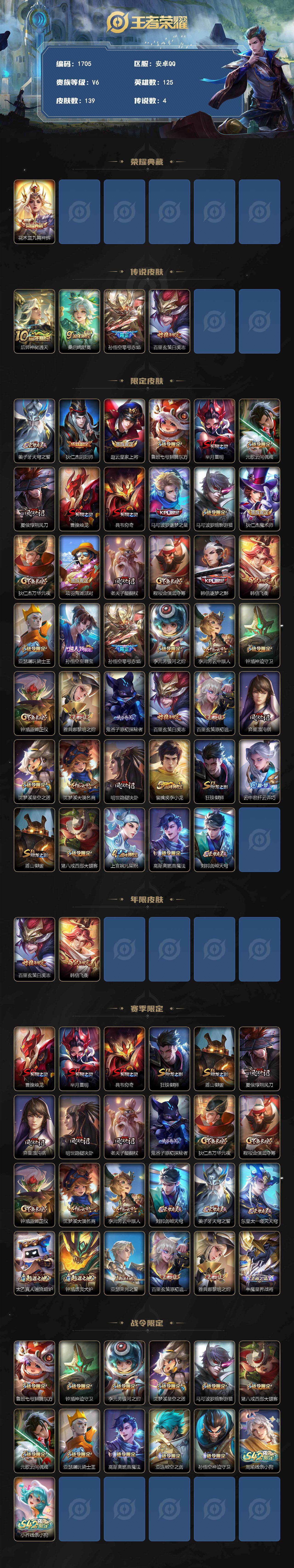 6/2742026 王者荣耀账号 安卓Q-V6-最强王者段位-125英雄-139皮肤-1典藏皮肤-4传说-34史诗