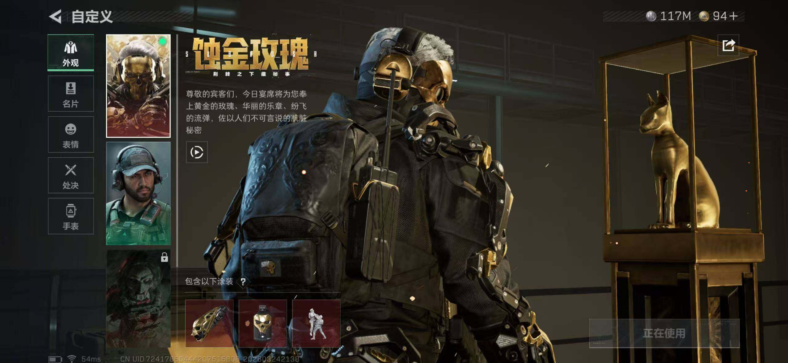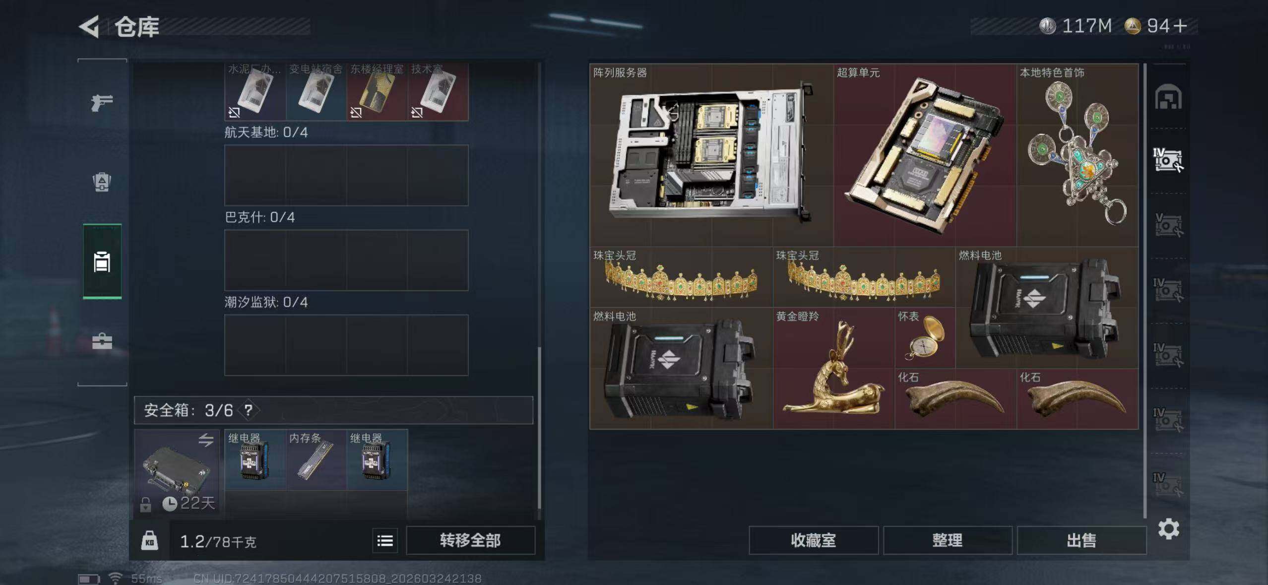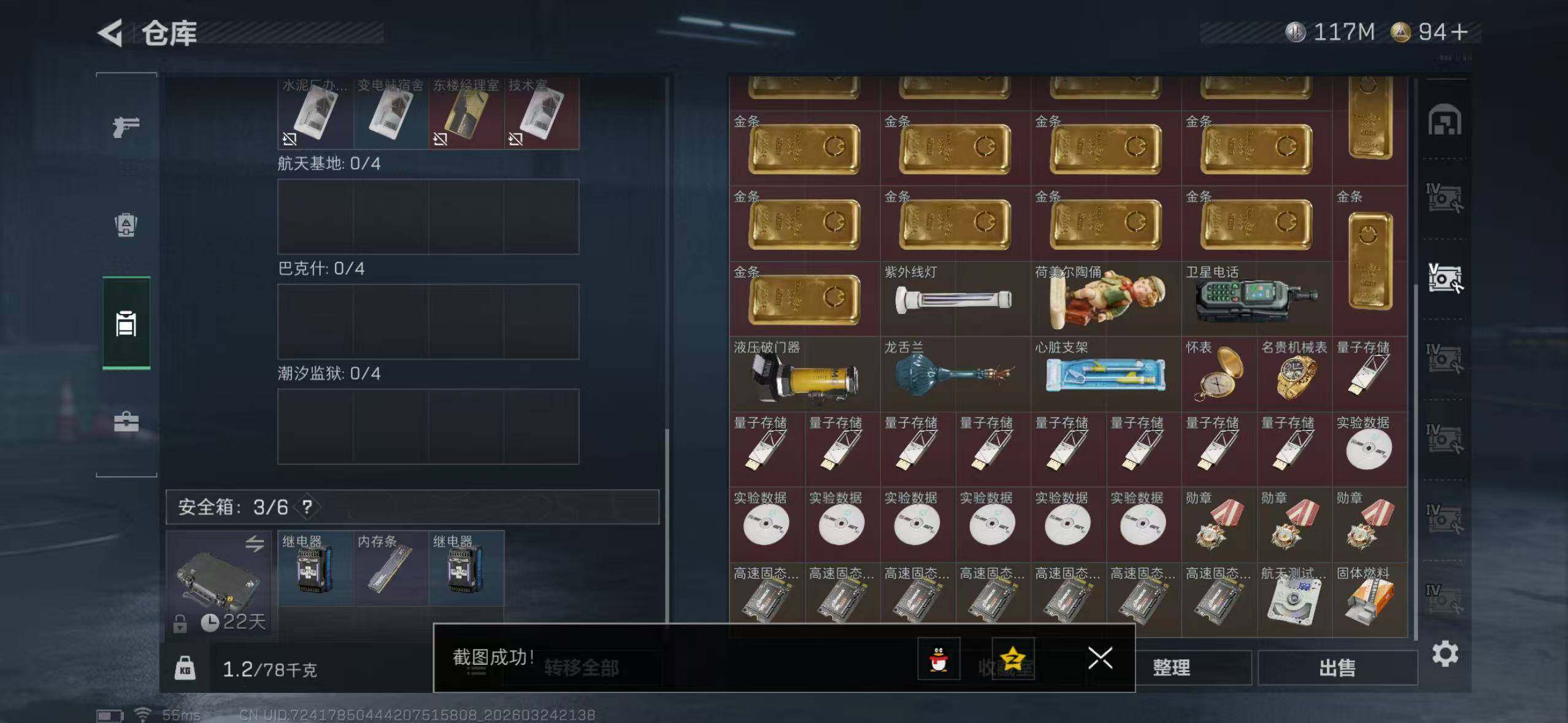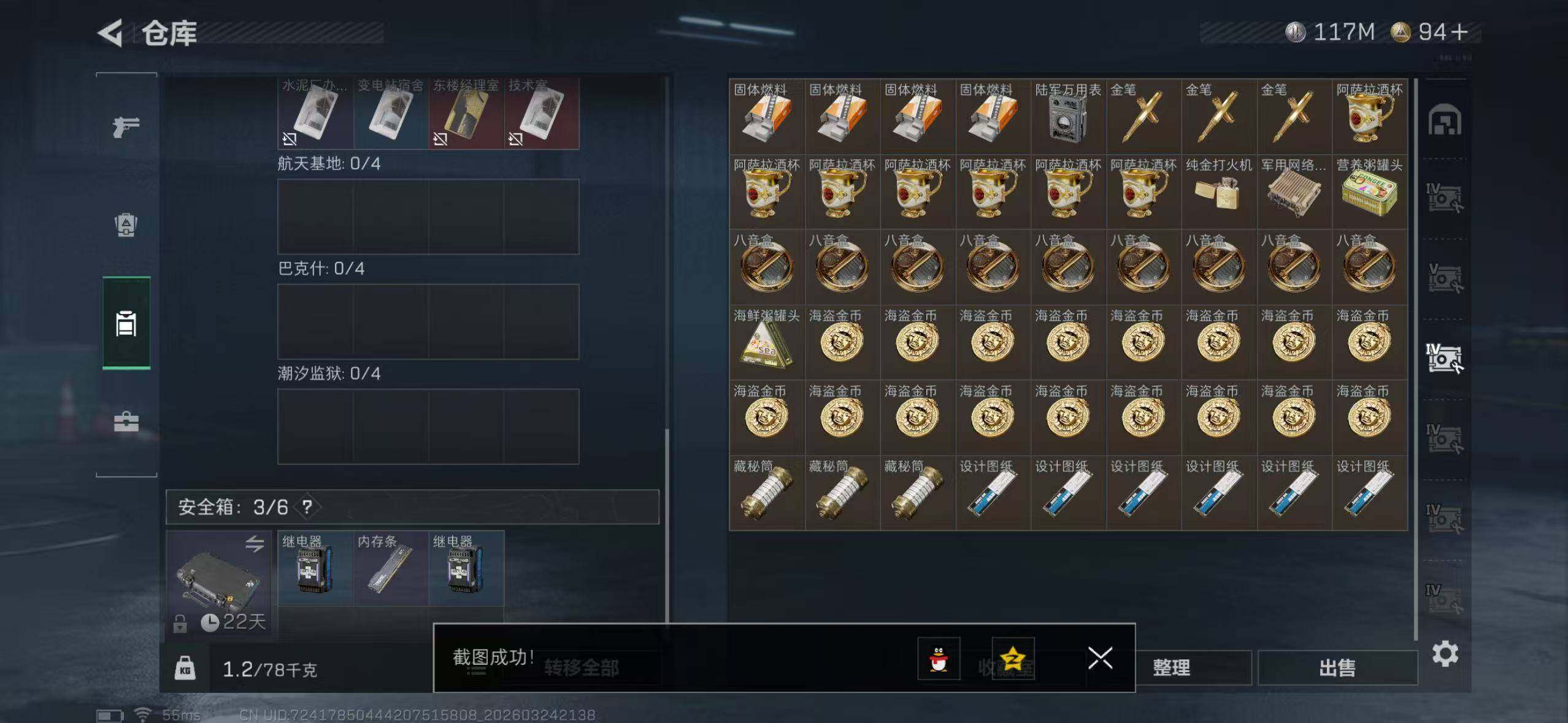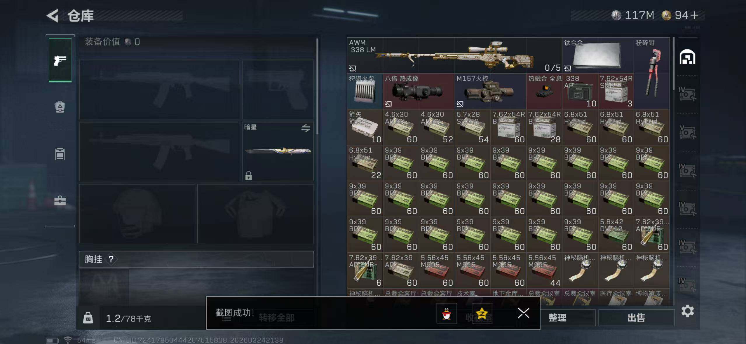 【SJ1532】【双刀三红皮还有砖皮】等级:60 总资产:353.8M 哈夫币:11956.7W 近战武器:近战武器-信条,近战武器-暗星,近战武器-处刑者 干员皮肤:蚀金玫瑰,金牌射手,凌霄戍卫,水墨云图,不羁人生 典藏外观:K416突击步枪-命运 安全箱:高级安全箱6(2x3)