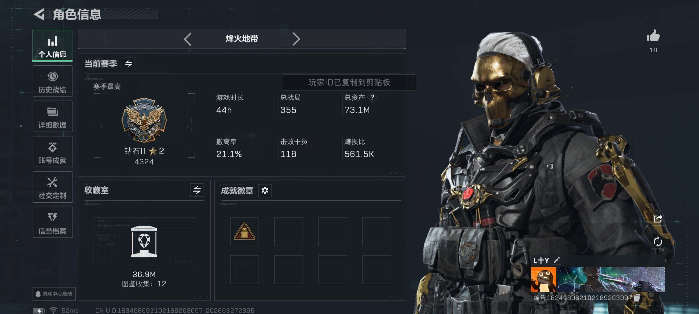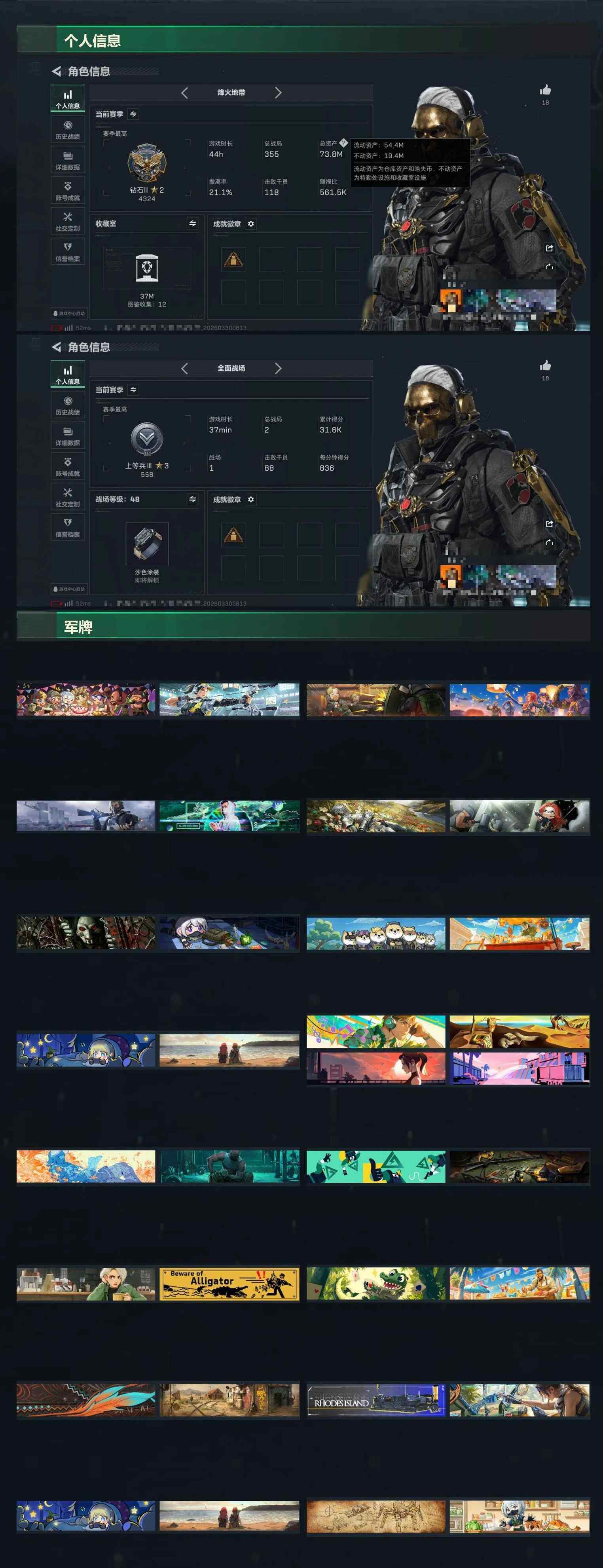 2红2刀精品成品号 精品成品号 纯绿无处罚 烽火地带段位: 钻石 全面战场段位: 上等兵 总资产: 73000000 哈夫币: 843000