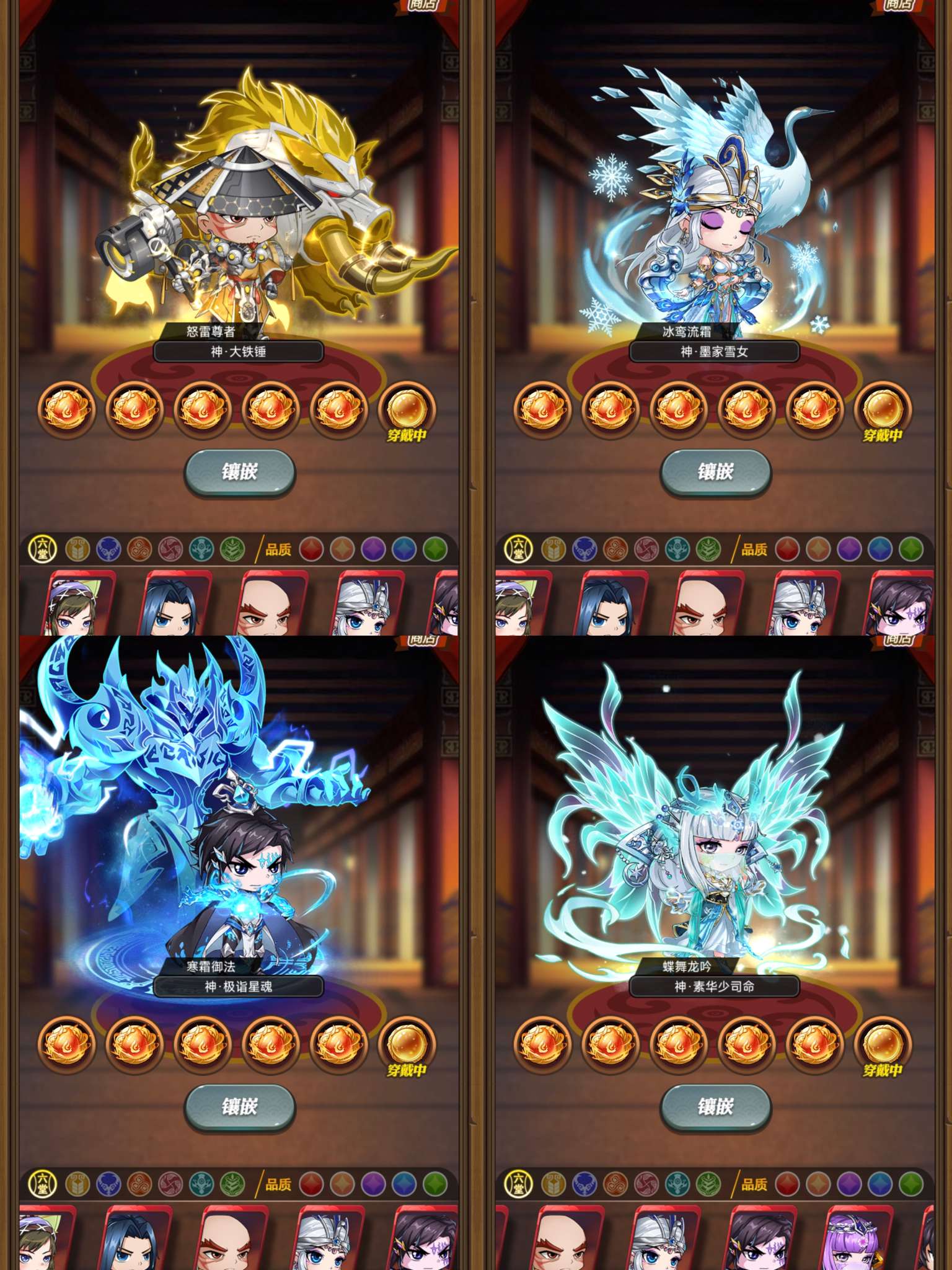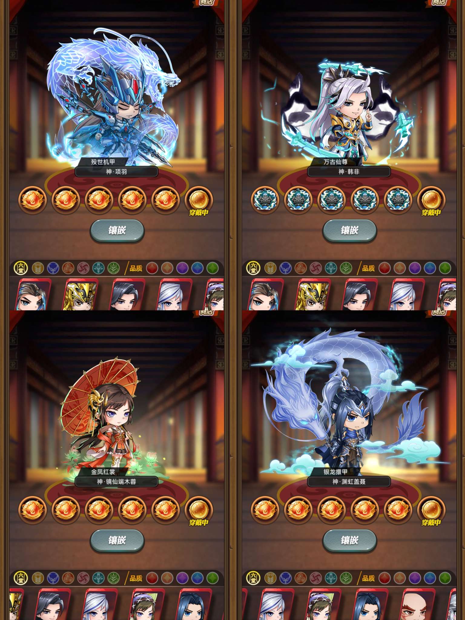 上阵除卫庄三重要皮其余全皮,阵下一大堆满时装带598石头。70多件神兵满锻神兵一大堆,满化身多几十个玉如意,2000只鸡,900聚神石,42万元宝400银符。8套满神行 满6星战纹 满神异护符 全10阶机关 13黑龙。背包很多橙色红色诸子卡,月卡长资源多特权钥匙🔑联赛四强实力,安卓苹果都可以玩续充四折