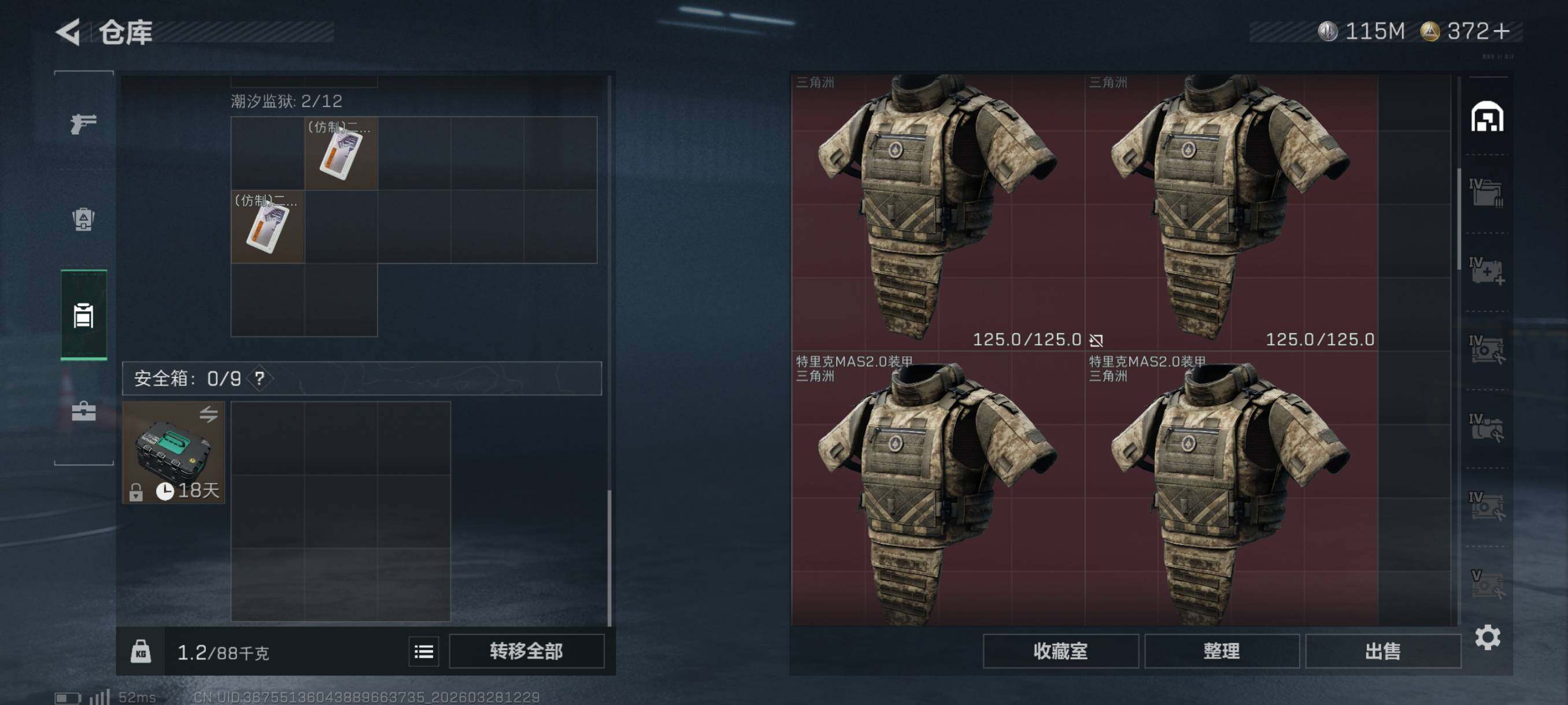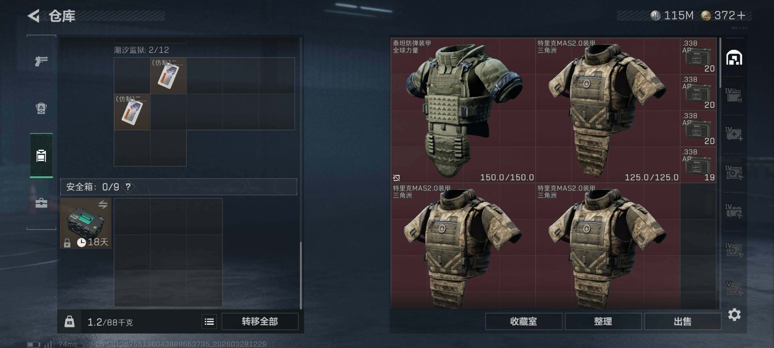 总资产217M/哈夫币11545万/传说近战数1/传说枪皮数16/战场等级5/行动等级60/安全箱等时效性道具以游戏内数据为准,详情请看图/乌鲁鲁-荒原猎手/近战-暗星/近战-黑鹰/AKM突击步枪-锦绣/SG552突击步枪-点翠/腾龙突击步枪-马年祥瑞/腾龙突击步枪-万金泪冠/K437突击步枪-锦绣/KC17突击步枪-点翠/SMG-45冲锋枪-锦绣/勇士冲锋枪-万金泪冠/QCQ171冲锋枪-不