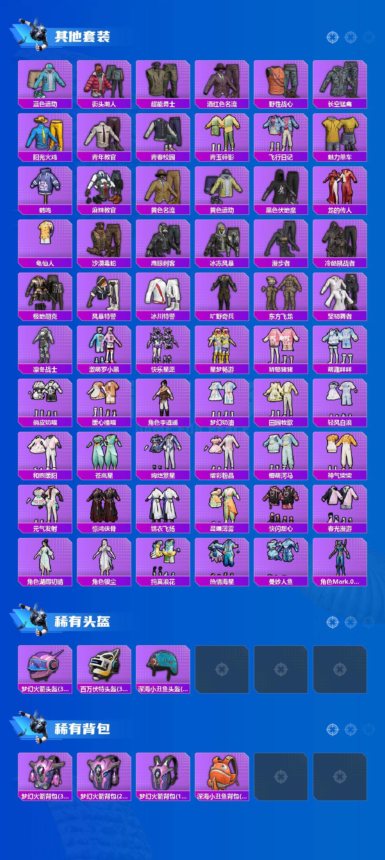 【粉色套装】:粉装-极限特训,粉装-金曜白虎,粉装-绚金战神,粉装-星之彼岸,粉装-旋转彩虹,粉装-闲梦青缨,角色-千金淑猫,角色-智耀战神