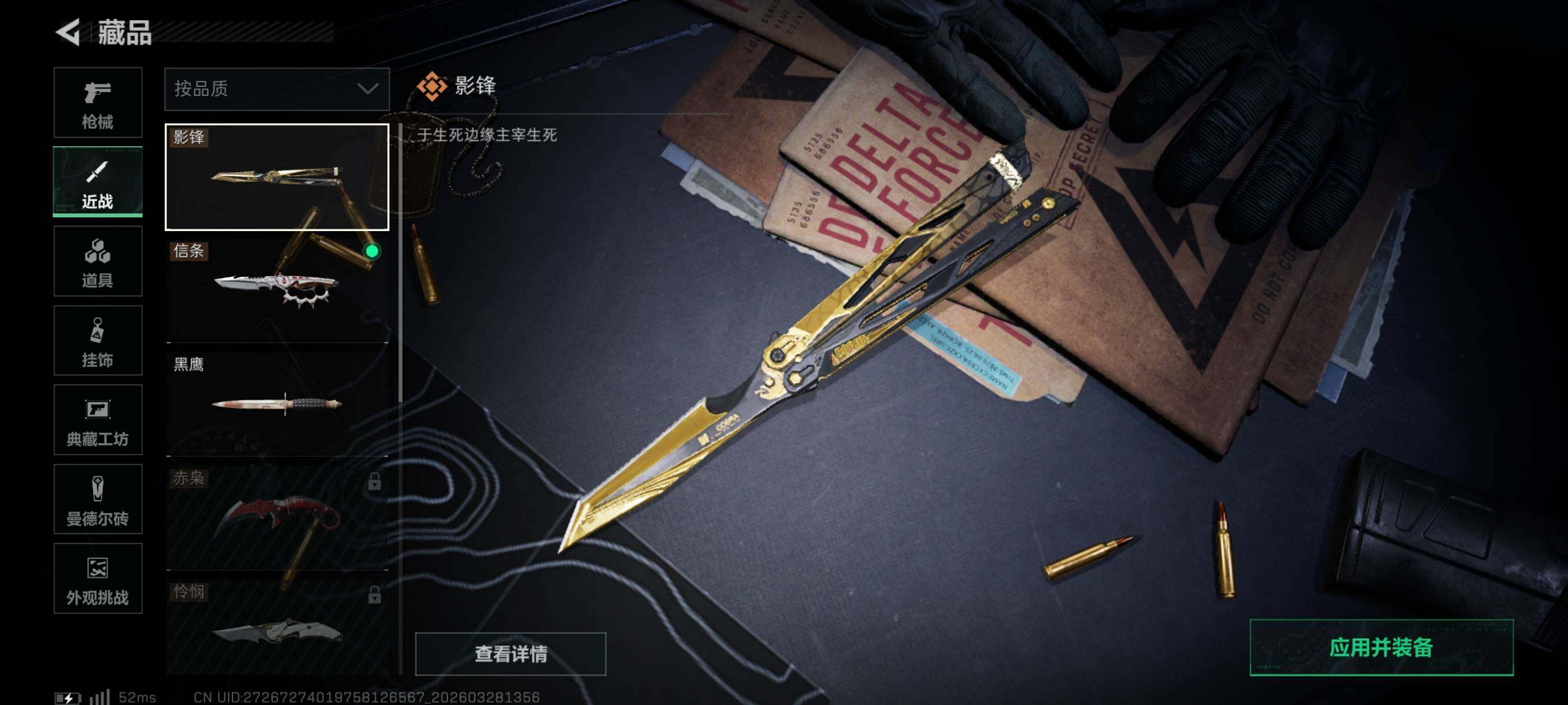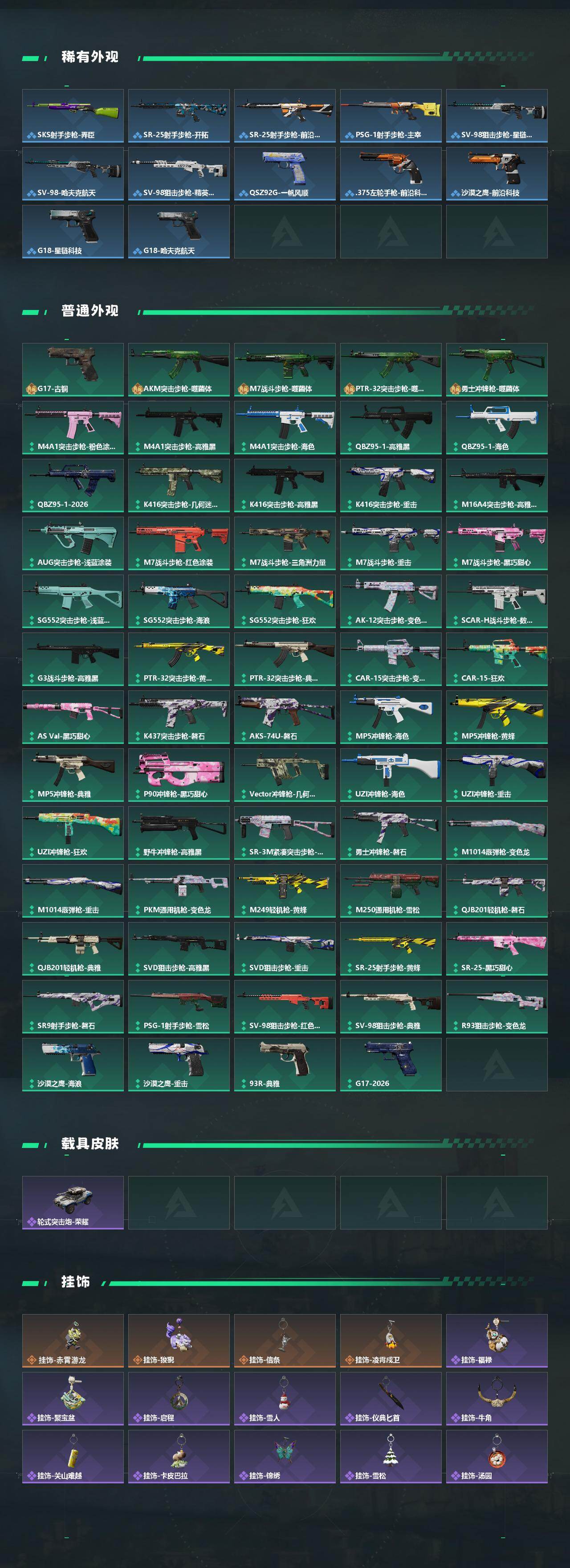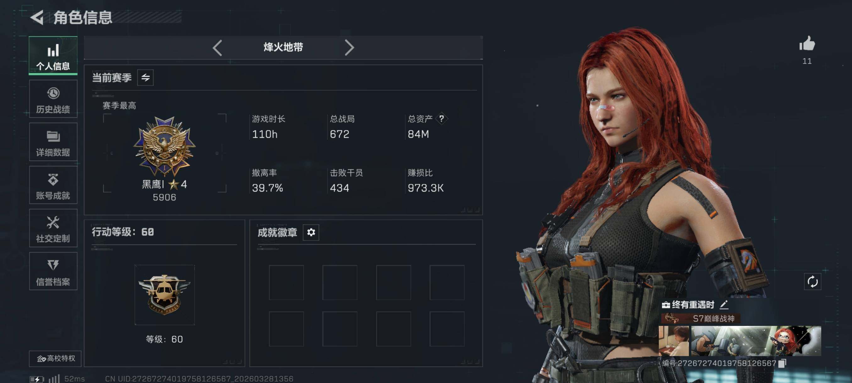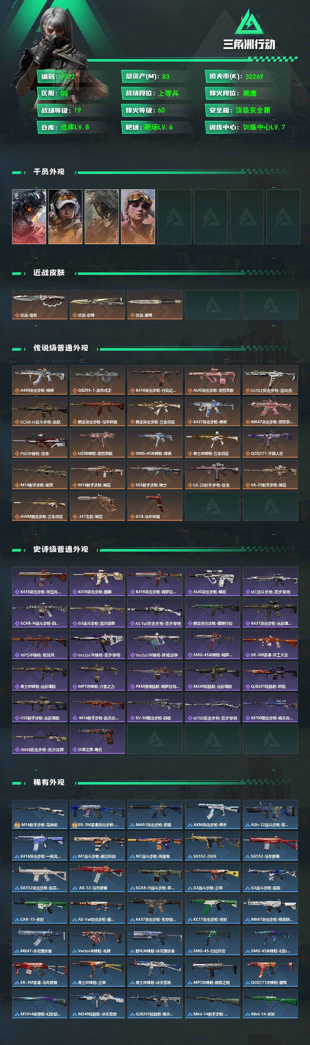 总资产83M/哈夫币3026万/传说近战数1/传说枪皮数23/战场等级19/行动等级60/安全箱等时效性道具以游戏内数据为准,详情请看图/威龙-凌霄戍卫/露娜-金牌射手/乌鲁鲁-荒原猎手/蛊-不羁人生/近战-信条/近战-影锋/近战-黑鹰/AKM突击步枪-锦绣/QBZ95-1突击步枪-凌霄戍卫/K416突击步枪-行动记录/AUG突击步枪-悠然茶歇/SG552突击步枪-运动员/SCAR-H战斗步枪