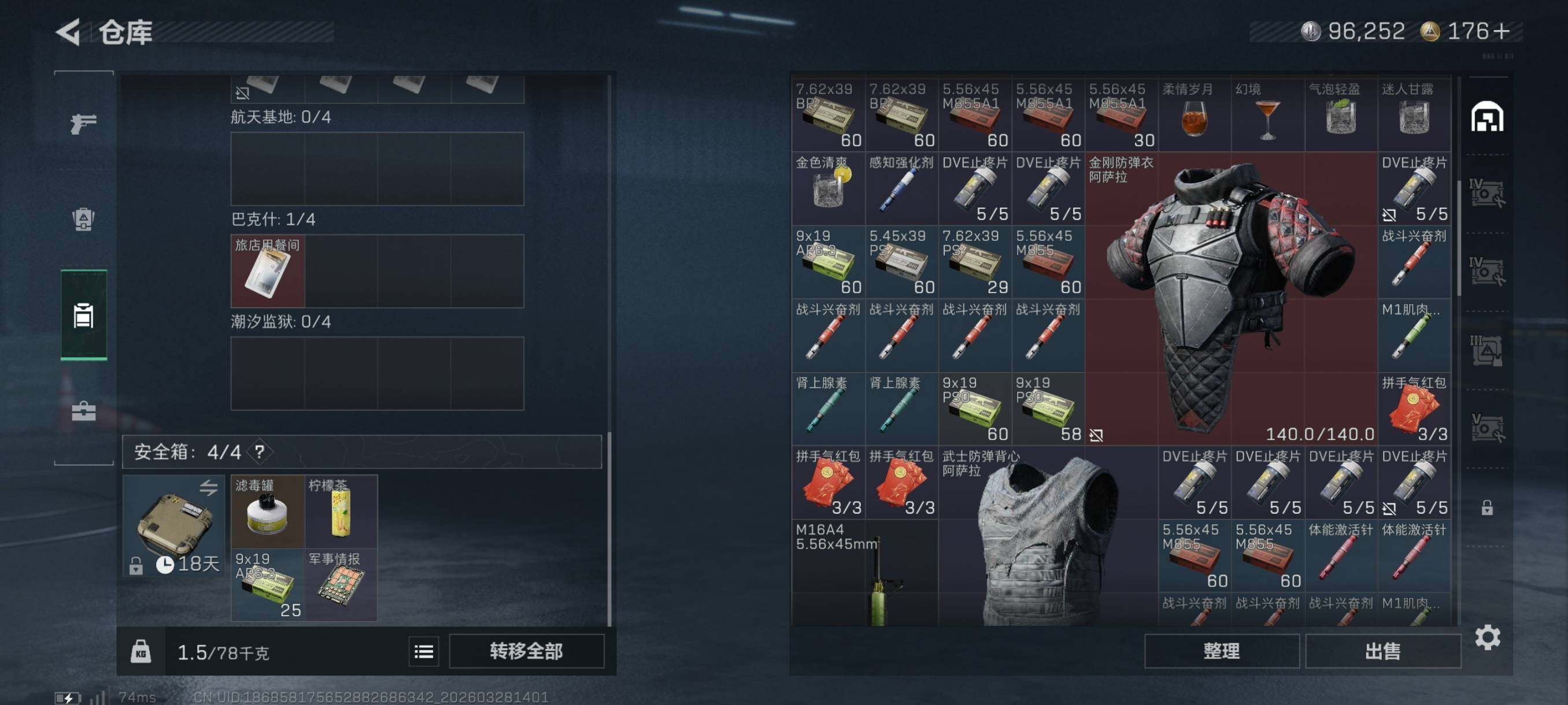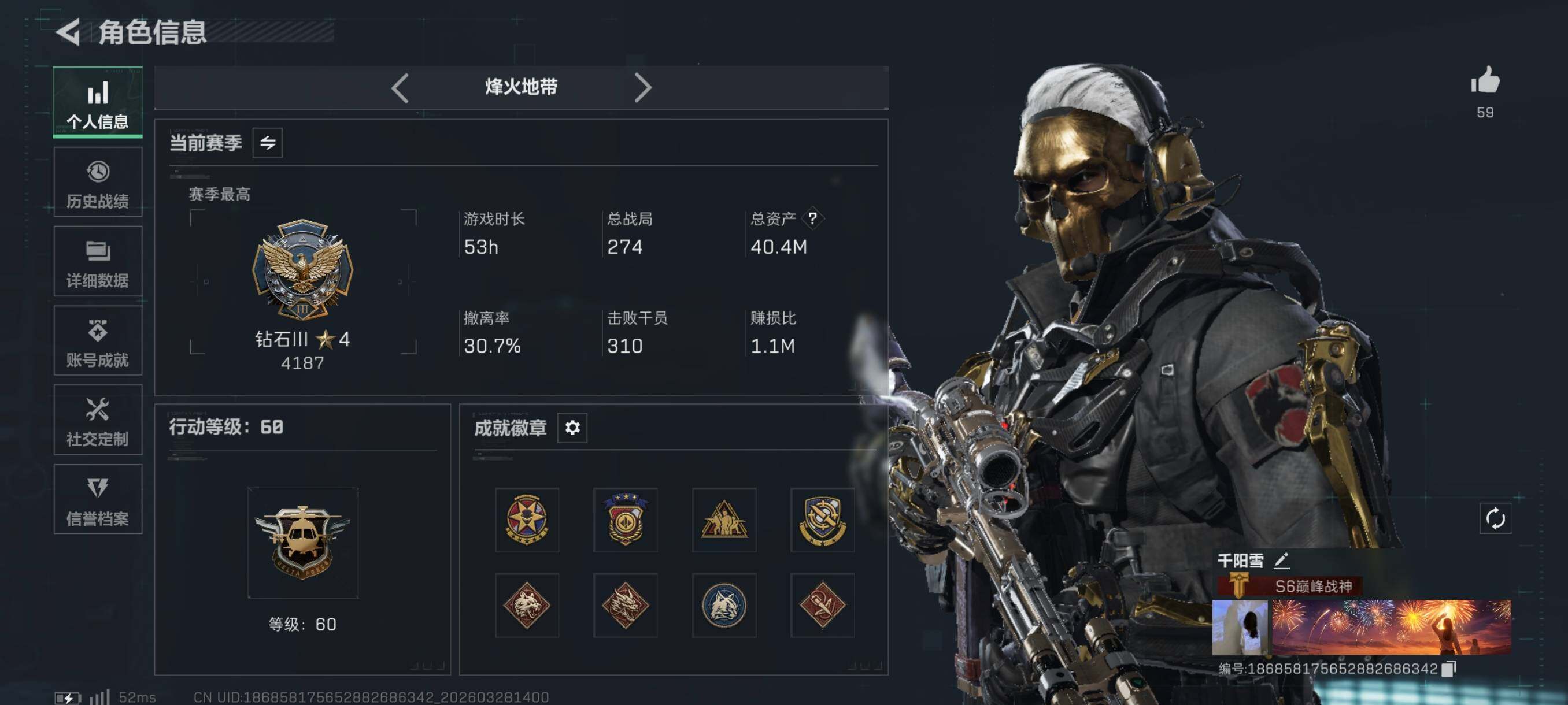 总资产40M/哈夫币9万/传说近战数1/传说枪皮数32/战场等级24/行动等级60/安全箱等时效性道具以游戏内数据为准,详情请看图/红狼-蚀金玫瑰/蜂医-送葬人·无题密令/露娜-金牌射手/红狼-黑鹰坠落/近战-暗星/近战-信条/近战-黑鹰/AS Val突击步枪-悬赏令/AS Val突击步枪-悬赏令(优品B)/M4A1突击步枪-蚀金玫瑰/M4A1突击步枪-阿米娅/ASh-12战斗步枪-鹅鸭杀/S