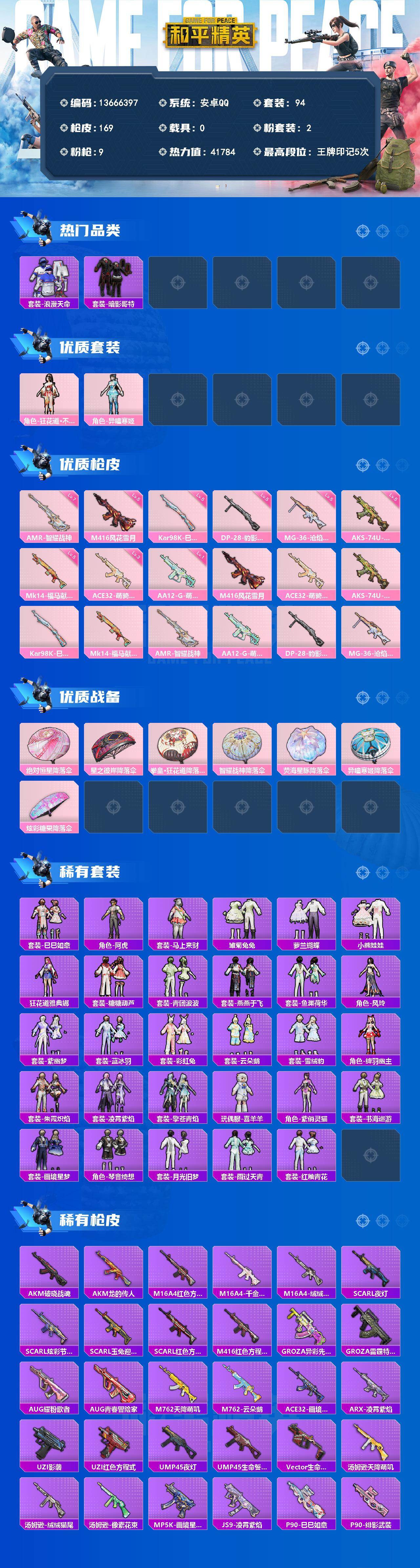 94套装/枪械9/装备183/战备97/王牌印记5/热力值41784/五级M416-风花雪月/三级ACE32-萌骑漫游/五级AKS-74U-森灵之息/五级Kar98K-巳巳如意/五级Mk14-福马献瑞/七级AMR-智耀战神/一级AA12-G-萌骑幻想/五级DP-28-豹影疾电/五级MG-36-沧焰双生/套装-浪漫天命/套装-暗影哥特/角色-狂花道·不知火舞/角色-异瞳寒姬/M416-风花雪月/A
