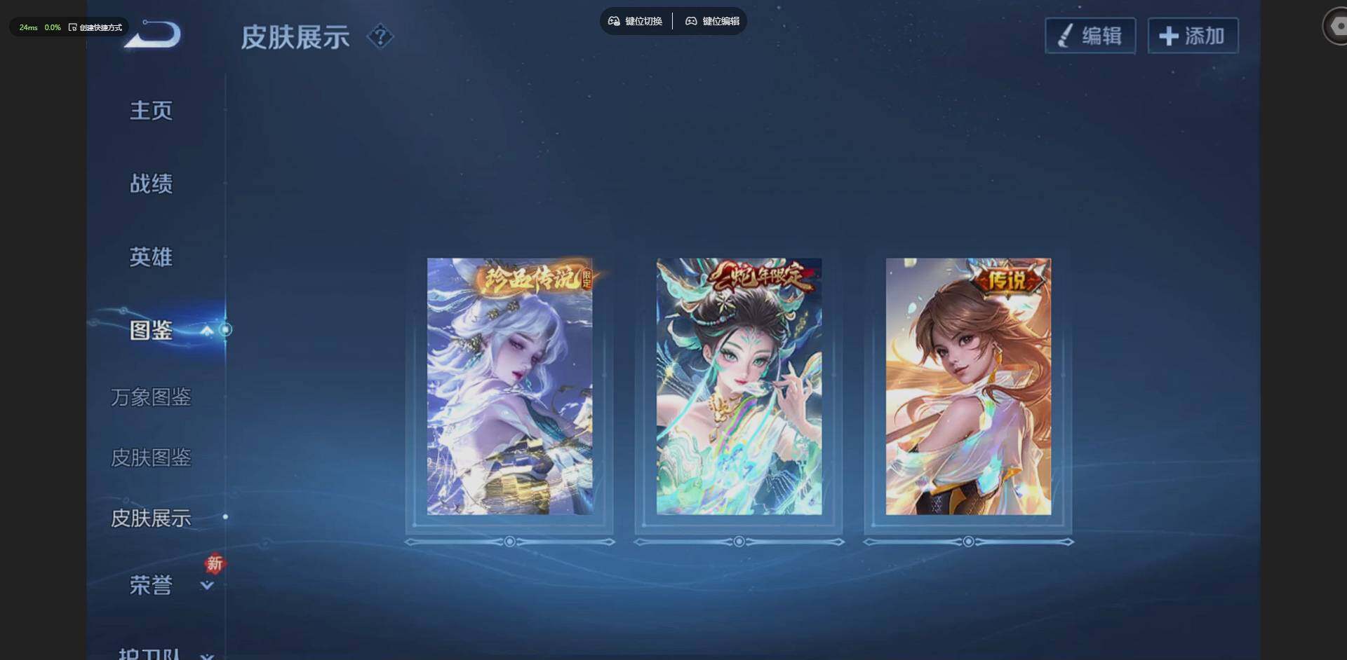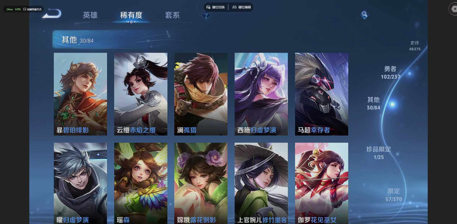 0/实名: 可修改 贵族等级: V6 英雄数: 126 皮肤数: 186 荣耀水晶: 拾光映像 珍品传说: 器灵·落星盏 传说皮: 冠军飞将,貂蝉曦玄引,幻光神枪 限定皮: 梁祝,五谷丰年,愿照·众生和