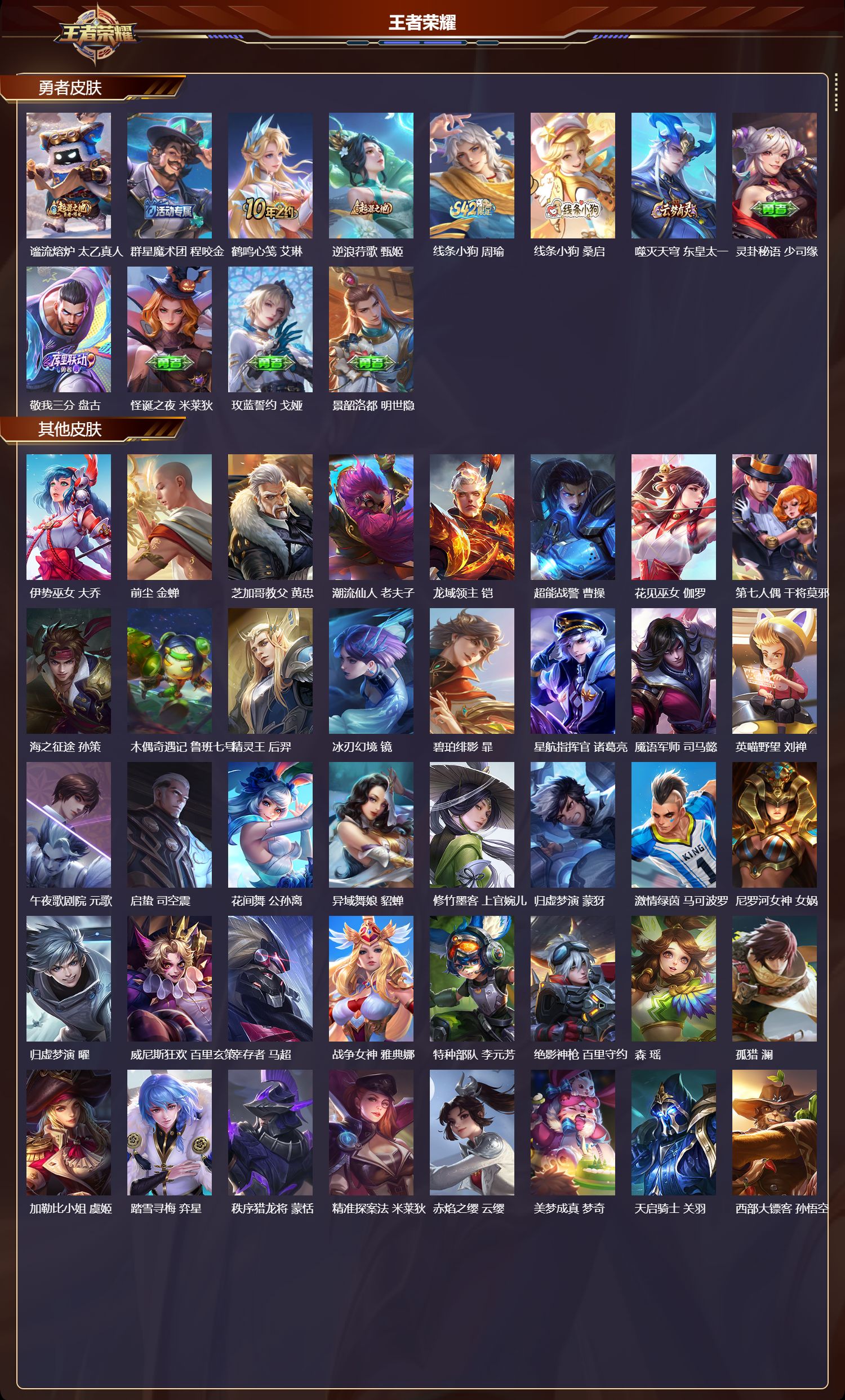 安卓QQ/至圣王者/190皮肤/126英雄/1典藏/0珍品无双/0无双/0珍品传说/9传说/49史诗/7稀有英雄【1 典藏皮肤】弑枪猎影 韩信,【9 传说皮肤】逐花归海 澜,地狱火 孙悟空,黄金射手座 后羿,久胜战神 干将莫邪,一念神魔 李信,超时空战士 狄仁杰,黄金白羊座 张良,愿照·九州拓 澜,鸣野蒿 桑启,【49 史诗皮肤】末日机甲 吕布,高山流水 庄周,山海·玄木吟 马可波罗,五谷丰年 鬼