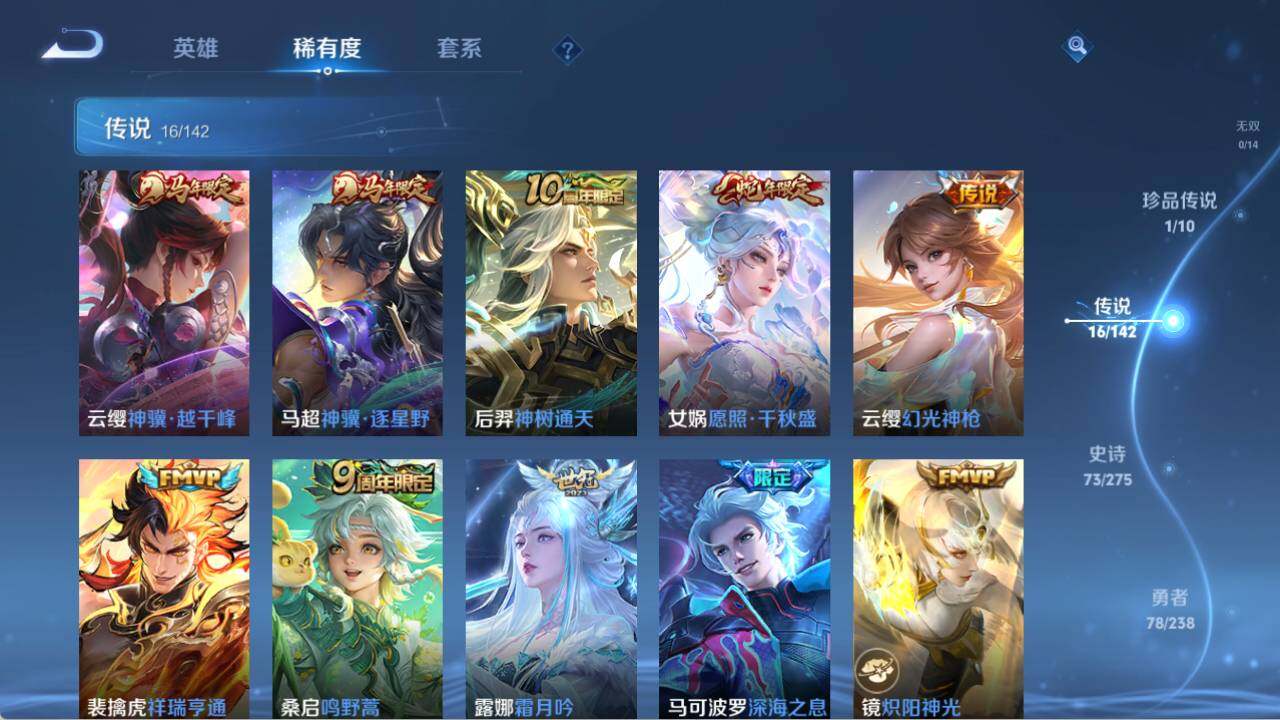 安卓Q-V7-最强王者段位-128英雄-198皮肤-2典藏皮肤-1珍品传说-16传说-72史诗