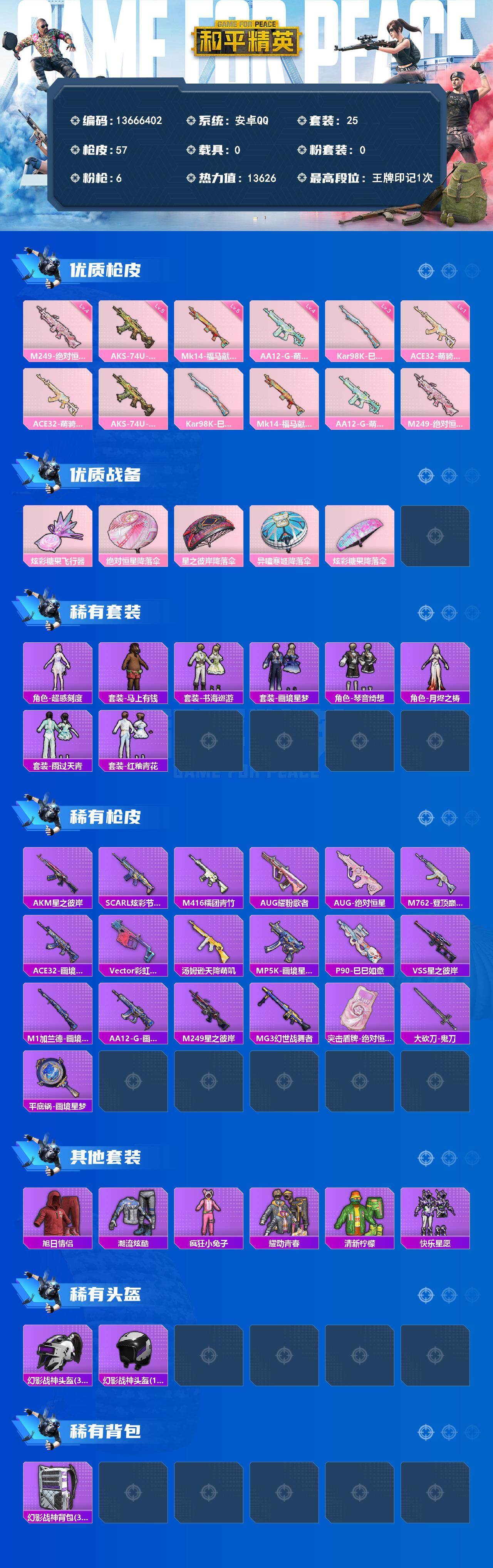 25套装/枪械6/装备71/战备37/王牌印记1/热力值13626/一级ACE32-萌骑漫游/五级AKS-74U-森灵之息/三级Kar98K-巳巳如意/五级Mk14-福马献瑞/四级AA12-G-萌骑幻想/四级M249-绝对恒星/ACE32-萌骑漫游/AKS-74U-森灵之息/Kar98K-巳巳如意/Mk14-福马献瑞/AA12-G-萌骑幻想/M249-绝对恒星/炫彩糖果飞行器/绝对恒星降落伞/星