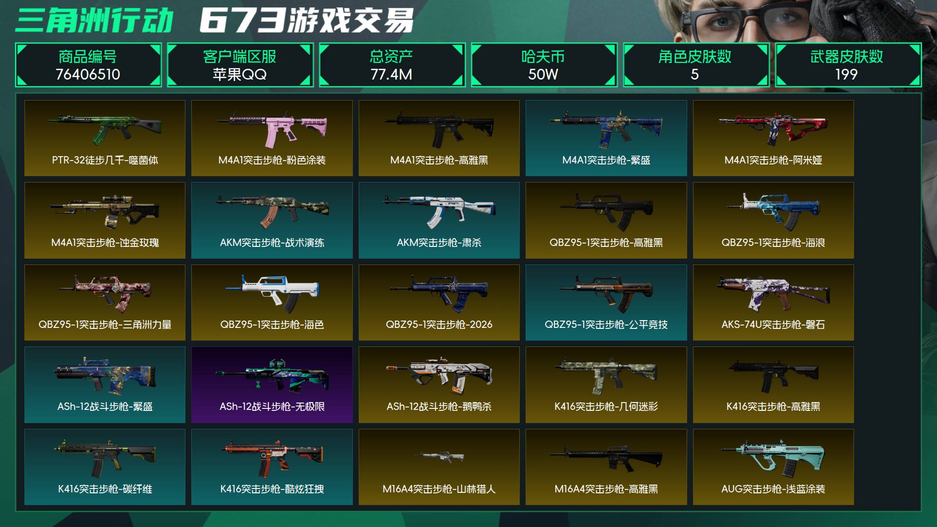 烽火段位钻石2 战场段位暂无段位 总资产77.4M 哈夫币50W 干员5 挂饰32 近战3 枪械199 载具15