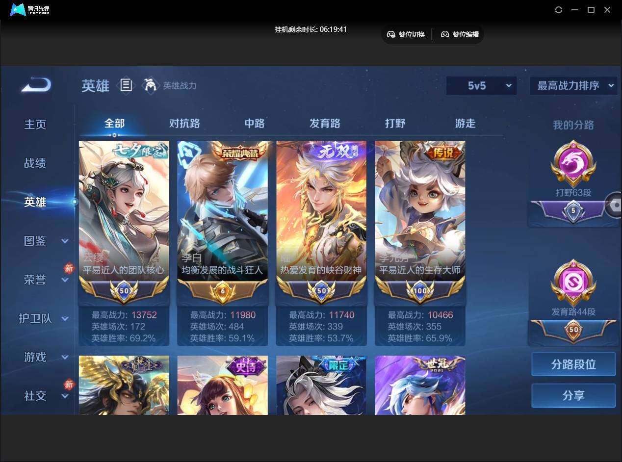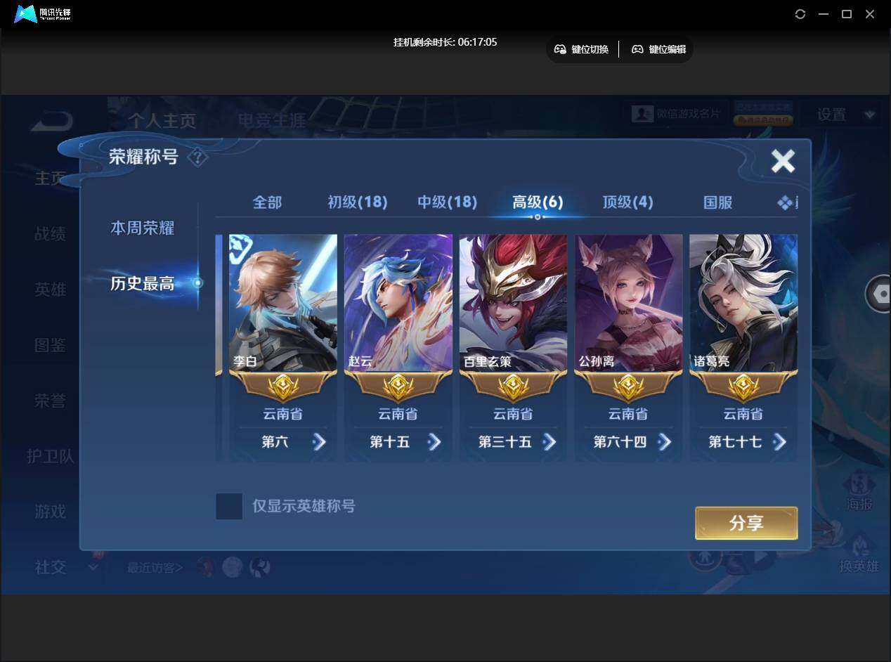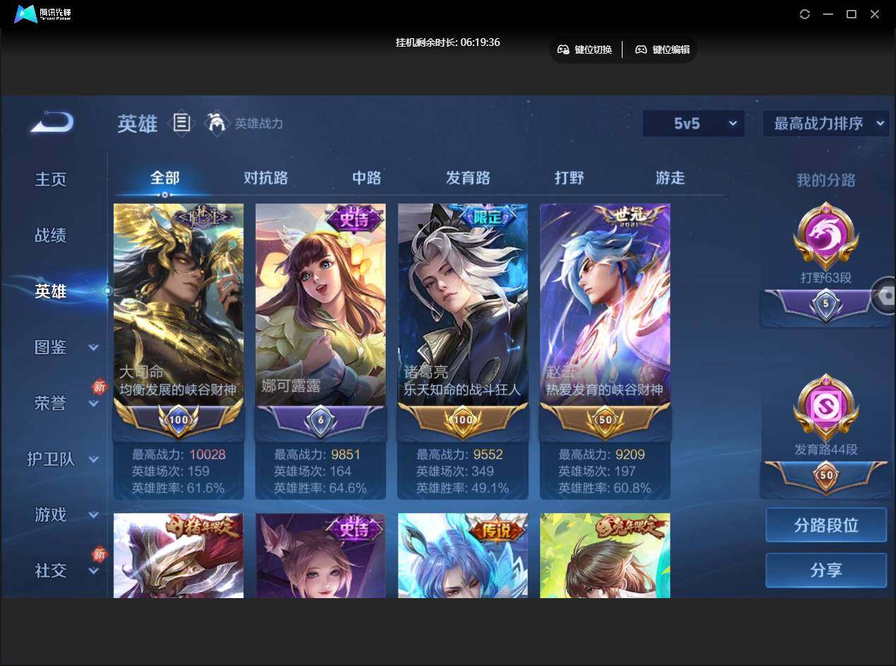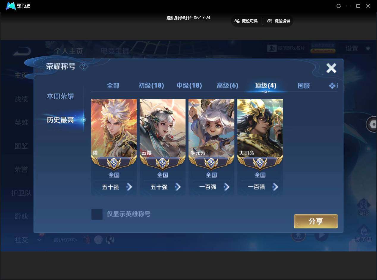 2749/【W6087】【限制可以解-打野63段-(4国标:云樱-曜-李元芳-大司马)-6省标-6k星币】 【爆款臻稀皮肤:鸣剑曳影-大秦宣太后-器灵螭龙剑-神罪-白虎志-凤求凰-愿照山河定-愿照众生和-山海炽霜斩-时雨天司-武圣-补天-鹤归松栖-启明星使-齐天大圣-鹤羽星尊】不可二次-贵9-127英雄-312皮肤-2典藏-2无双-3星元-40传说-