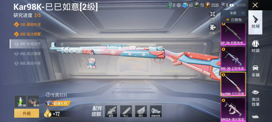 435-【2粉装6特效枪 可秒换绑不用等】 安卓Q区-41785热力值-118套装-149枪皮 【1稀有】 奇异狩猎者【2粉装】 第五大道 幻彩电音【6特效枪】 Mk14-福马献瑞(3级) UMP45-萌骑冒险(5级) MG-36-幻彩电音(7级) GROZA-镜光银凌(5级) Kar98K-巳巳如意(2级) DP-28-豹影疾电(1级)【24热门】 M416-蓝色火焰 GROZA-彩虹符号