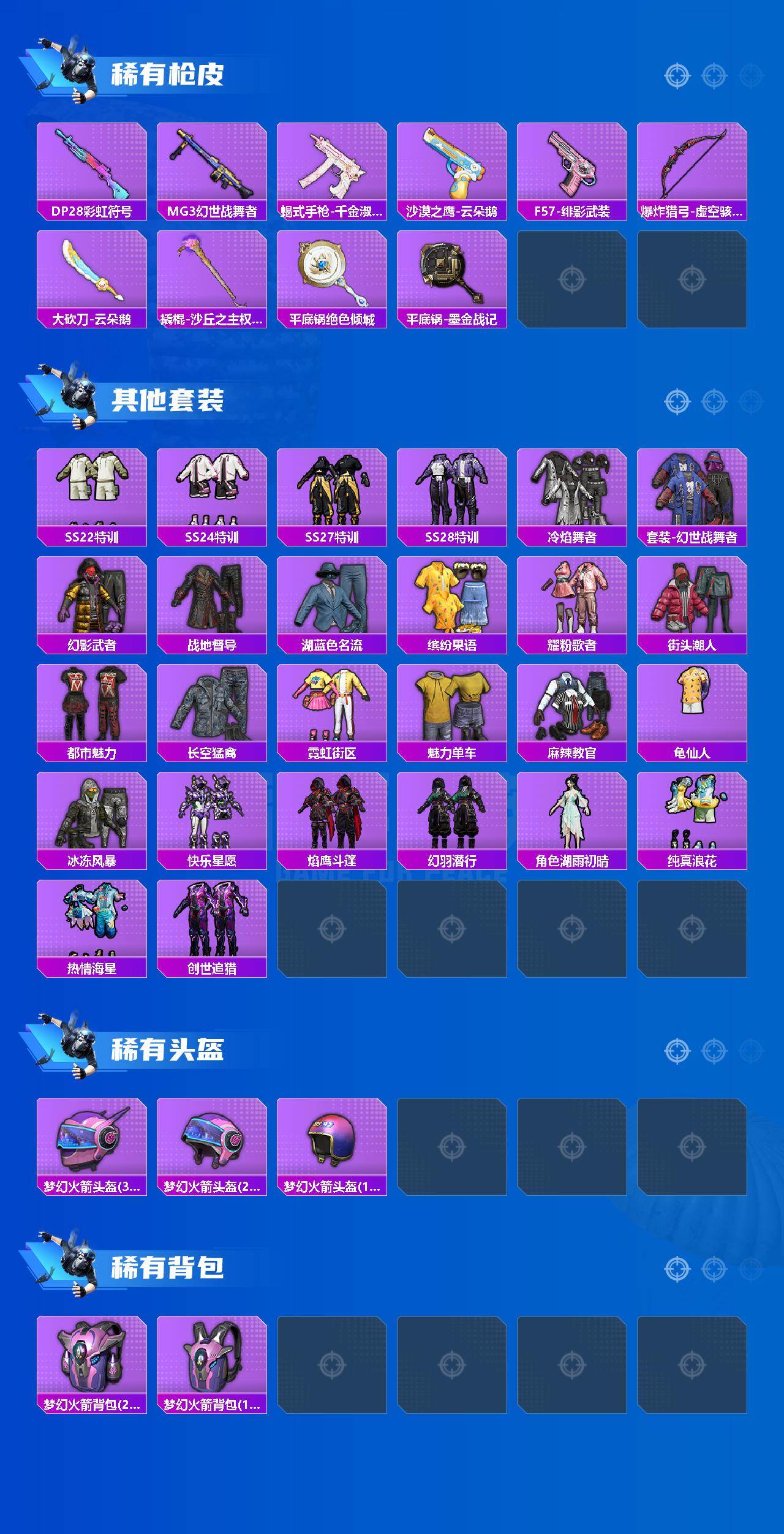 扭蛋碎片769 可二次【特价出售/店主推荐】安卓 手Q-4粉装-3特效枪-3载具-2粉色飞行器-39328热力值-1王牌印记-70套装-124枪皮【热门品类】:粉装-梦幻火箭,套装-龟仙人【粉色套装】:粉装-梦幻火箭,粉装-星之彼岸,粉装-星穹咏叹调,角色-霓裳阁主【粉色枪皮等级】:UMP45-萌骑冒险(五级),Kar98K-巳巳如意(五级),Mk14-福马献瑞(五级)【粉色载具】:法拉利LaF