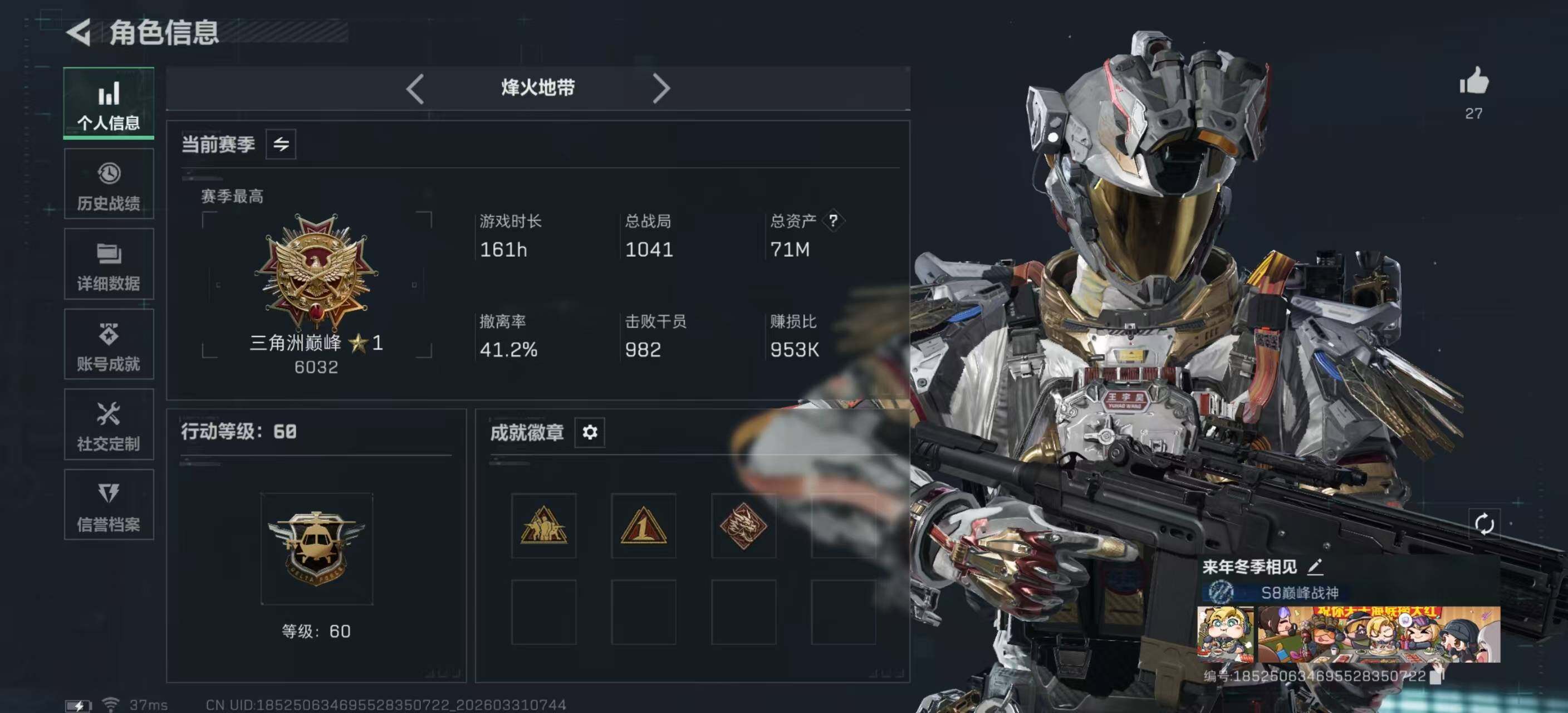70m总资产-6873k哈夫币-60烽火等级-黑鹰-31战场等级-上等兵