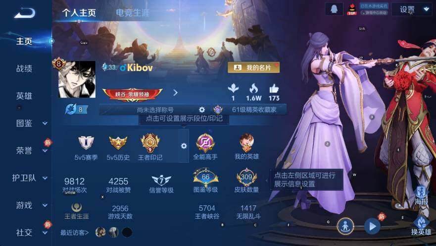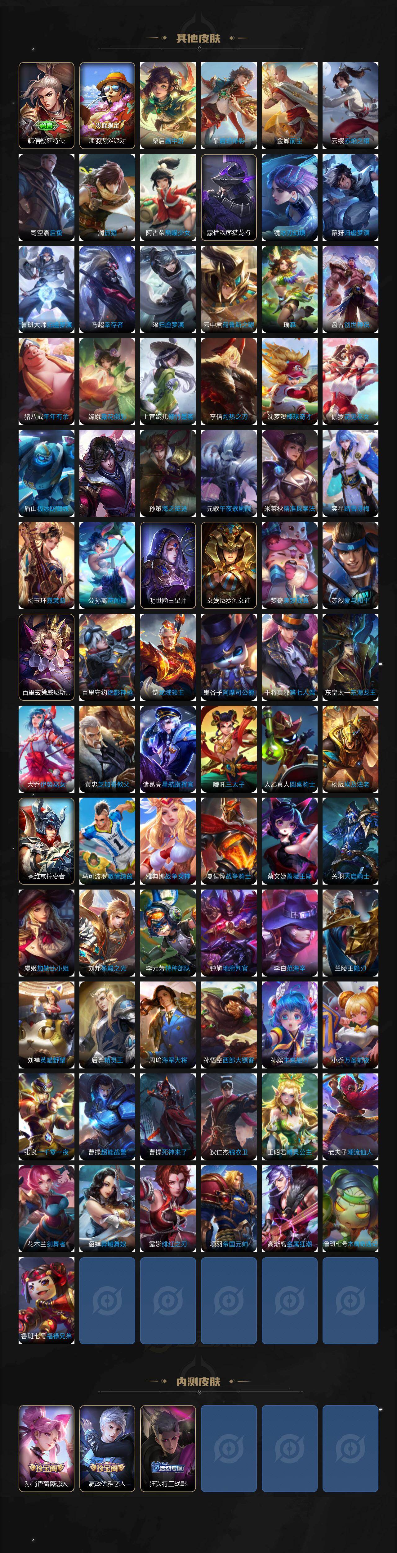 贵族等级8/荣耀典藏数量1/传说皮肤数量9/史诗皮肤数量87/皮肤数量309/英雄数量126/段位永恒钻石/钟馗全皮/海诺全皮/鸣剑·曳影 李白/山海·炽霜斩 李信/异界灵契 孙尚香/时雨天司 诸葛亮/启明星使 虞姬/武圣 关羽/太华 伽罗/猫影幻舞 貂蝉/仲夏夜之梦 貂蝉/末日机甲 孙尚香/天穹之誓 姜子牙/阴阳师 狄仁杰/皇家上将 赵云/神迹守卫 墨子/时之彼端 妲己/优雅恋人 嬴政/白昼