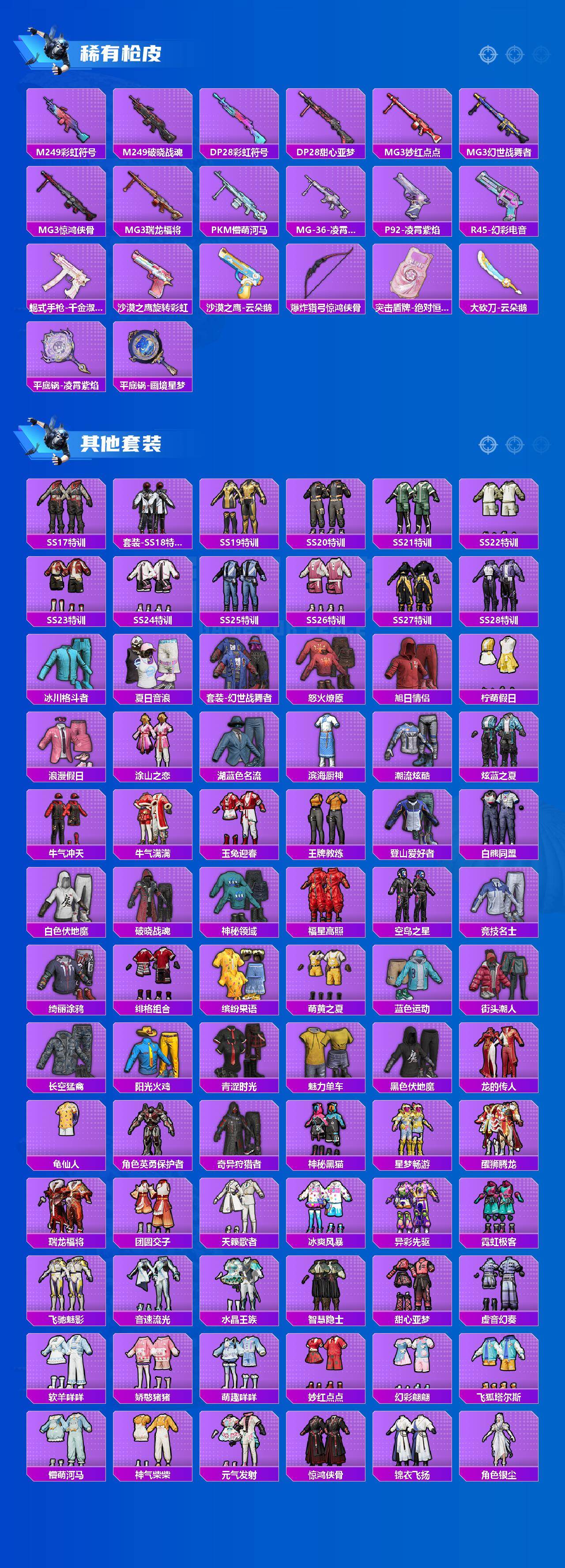 粉装7/粉枪5/载具3/珍稀飞行器,72237,72270,/套装134/枪皮238/热力值70247/历史最高段位:王牌印记7次/Lv:60/七级M416-风花雪月/五级ACE32-萌骑漫游/五级Kar98K-巳巳如意/五级Mk14-福马献瑞/五级DP-28-豹影疾电/粉装-梦幻火箭/奇异狩猎者/套装-龟仙人/梦幻火箭/香水柠檬/洛天依/寒光使者/炫光之旅/角色-智耀