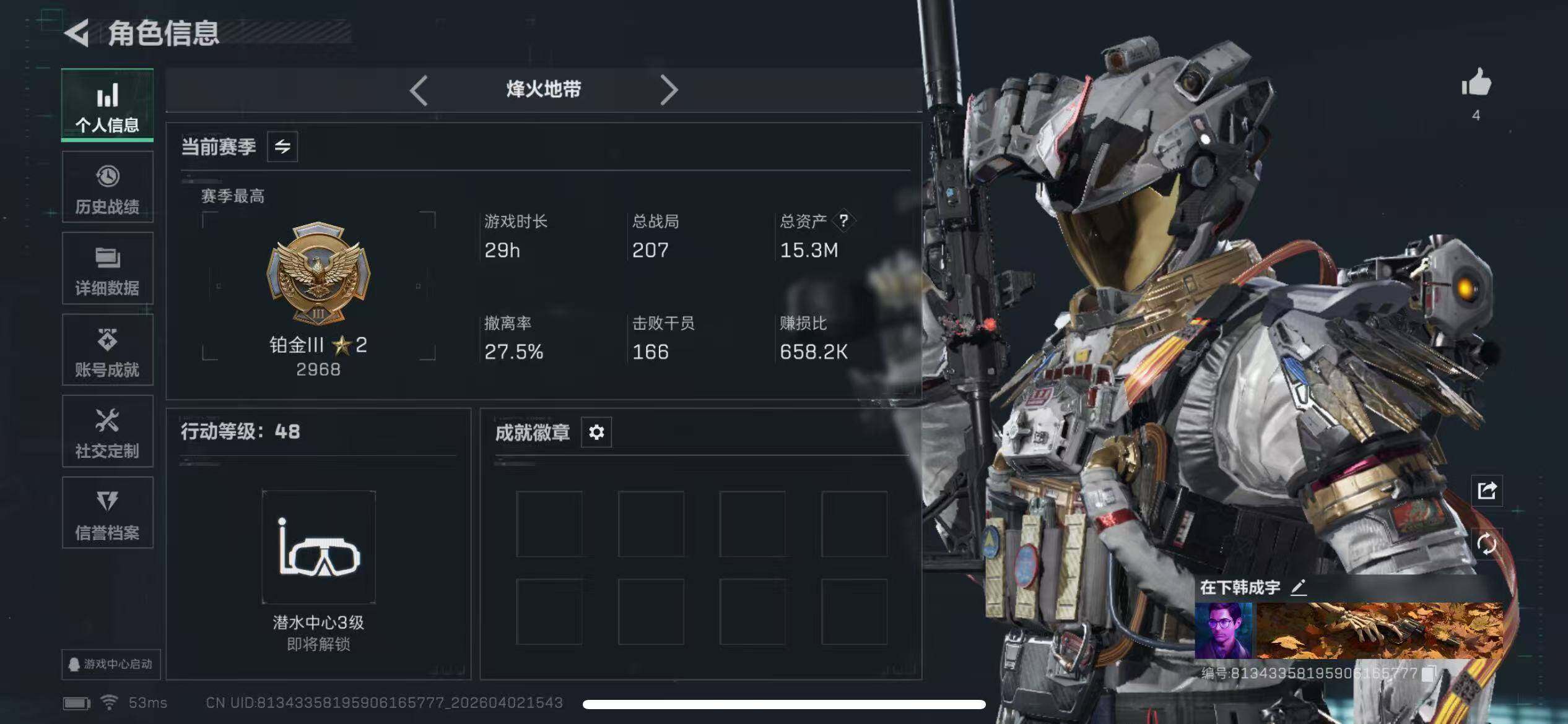 【特价出售/店主推荐】15m总资产-5k哈夫币-48烽火等级-铂金-1战场等级-无军衔