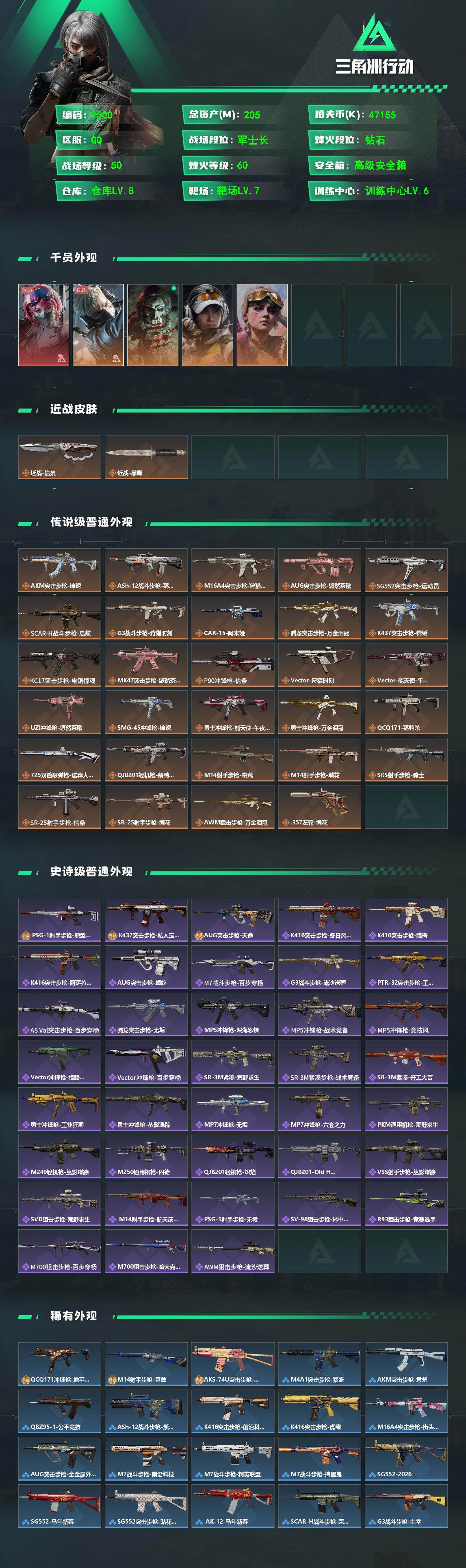 总资产205M/哈夫币4715万/传说近战数1/传说枪皮数29/战场等级50/行动等级60/安全箱等时效性道具以游戏内数据为准,详情请看图/蛊-能天使·午夜邮差/蜂医-送葬人·无题密令/红狼-电锯惊魂/露娜-金牌射手/蛊-不羁人生/近战-信条/近战-黑鹰/AKM突击步枪-锦绣/ASh-12战斗步枪-鹅鸭杀/M16A4突击步枪-狩猎时刻/AUG突击步枪-悠然茶歇/SG552突击步枪-运动员/SC