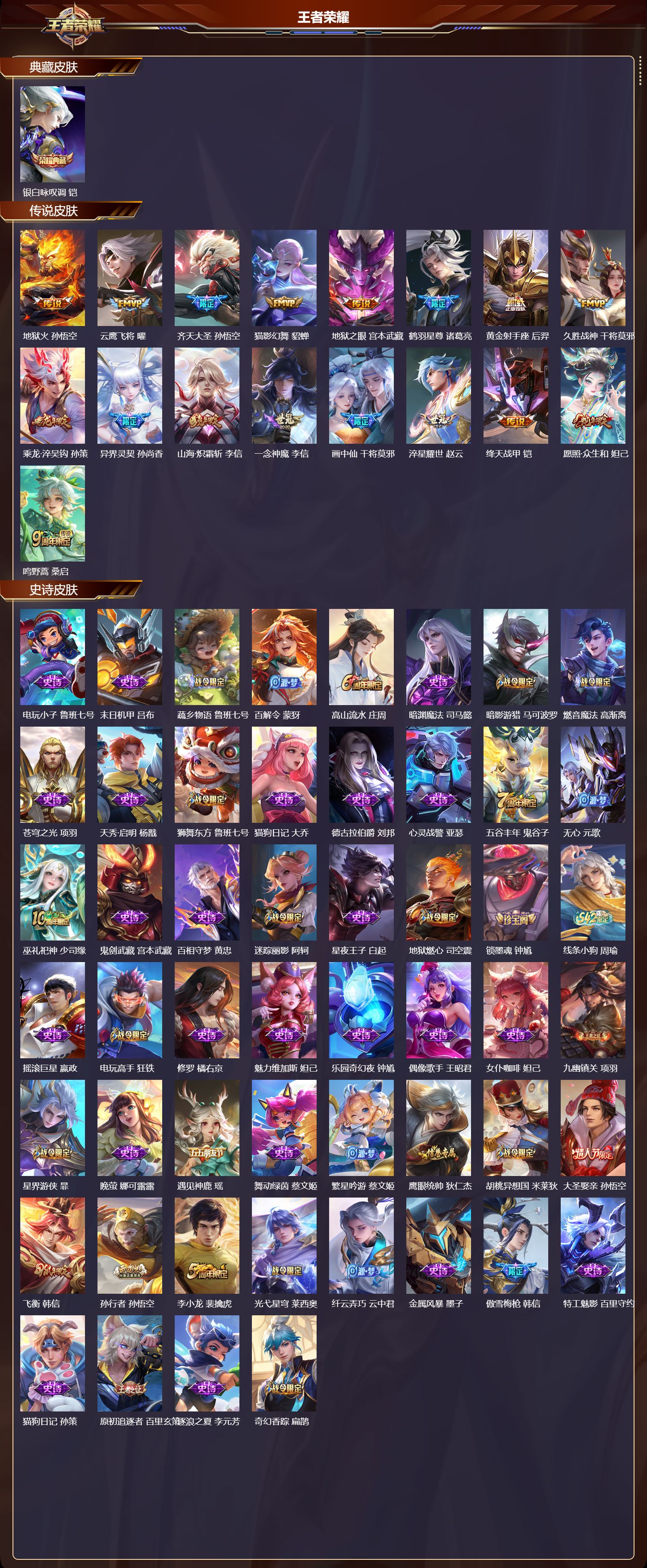 安卓QQ/最强王者/350皮肤/127英雄/1典藏/0珍品无双/0无双/0珍品传说/17传说/109史诗/8稀有英雄【1 典藏皮肤】银白咏叹调 铠,【17 传说皮肤】地狱火 孙悟空,云鹰飞将 曜,齐天大圣 孙悟空,猫影幻舞 貂蝉,地狱之眼 宫本武藏,鹤羽星尊 诸葛亮,黄金射手座 后羿,久胜战神 干将莫邪,乘龙·淬吴钩 孙策,异界灵契 孙尚香,山海·炽霜斩 李信,一念神魔 李信,画中仙 干将莫邪,淬