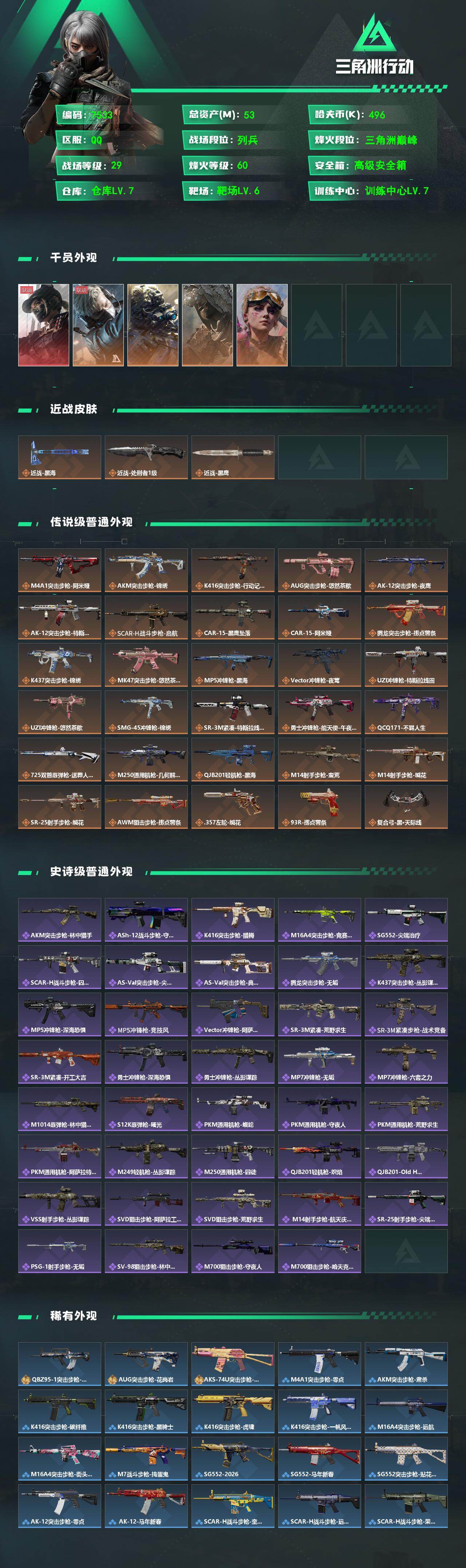 总资产53M/哈夫币49万/传说近战数1/传说枪皮数30/战场等级29/行动等级60/安全箱等时效性道具以游戏内数据为准,详情请看图/露娜-黑·天际线/蜂医-送葬人·无题密令/无名-夜鹰/乌鲁鲁-荒原猎手/蛊-不羁人生/近战-黑海/近战-处刑者/近战-黑鹰/M4A1突击步枪-阿米娅/AKM突击步枪-锦绣/K416突击步枪-行动记录/AUG突击步枪-悠然茶歇/AK-12突击步枪-夜鹰/AK-12