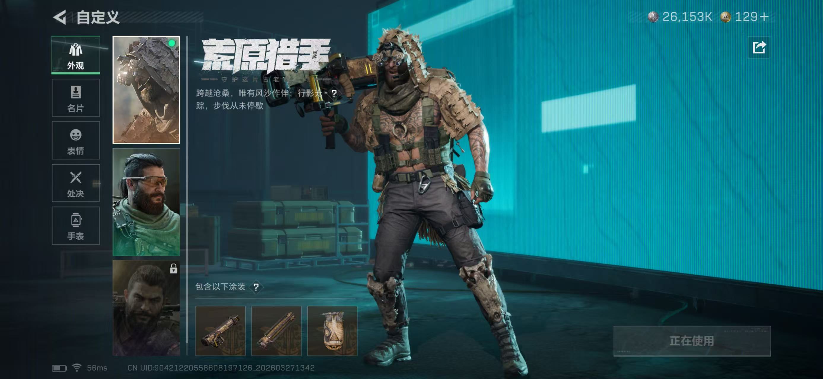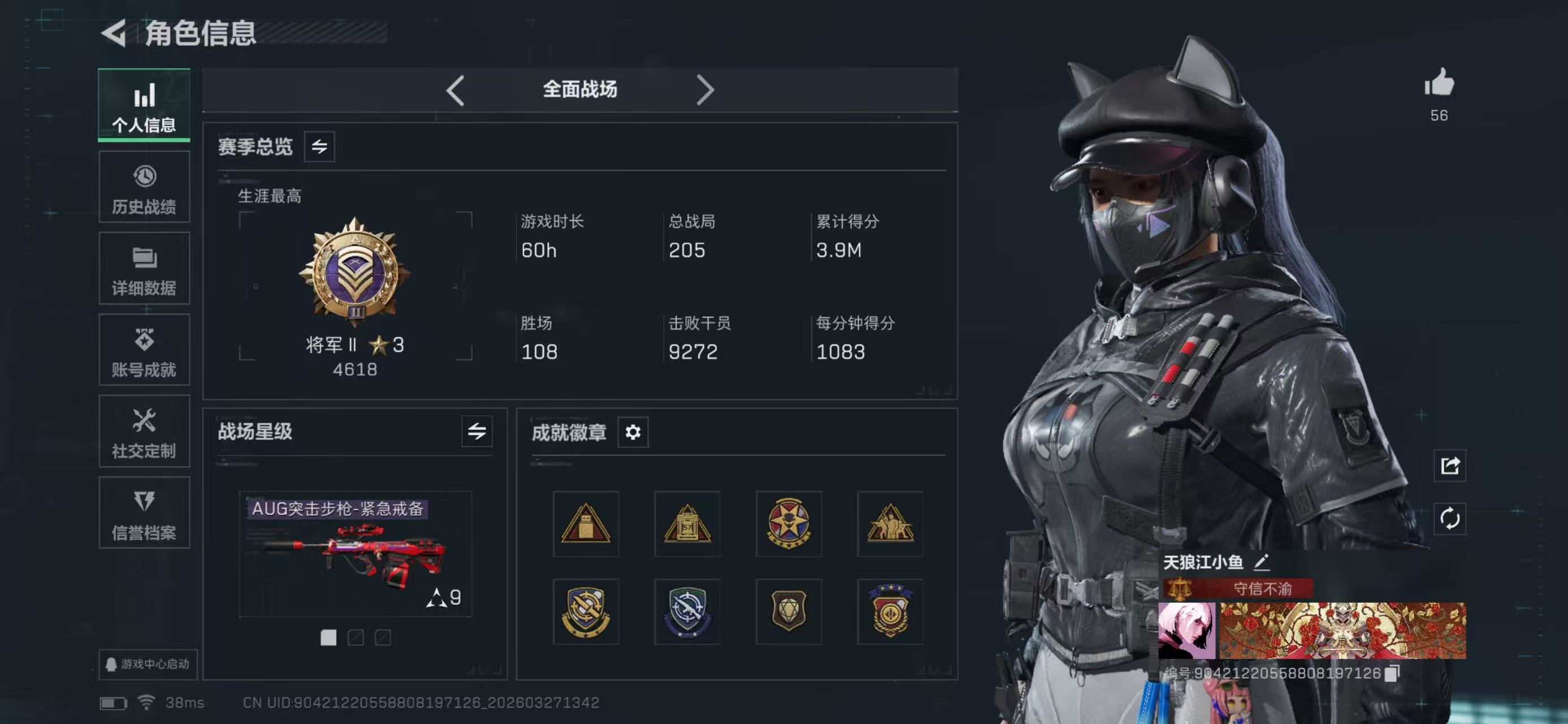 总资产383.05M,哈夫币 26153.34K,战场等级:50 上等兵,行动等级:60 黑鹰,角色皮肤7,枪皮数量166【特战干员外观】乌鲁鲁-荒原猎手,露娜-黑·天际线,蜂医-送葬人·无题密令,无名-夜鹰,红狼-电锯惊魂,露娜-金牌射手,深蓝-不破誓约,【近战】近战-北极星,近战-黑鹰,【典藏外观】M4A1突击步枪-千里骏骨,QBZ95-1突击步枪-花岗岩,AS Val突击步枪-星之彩,SG5