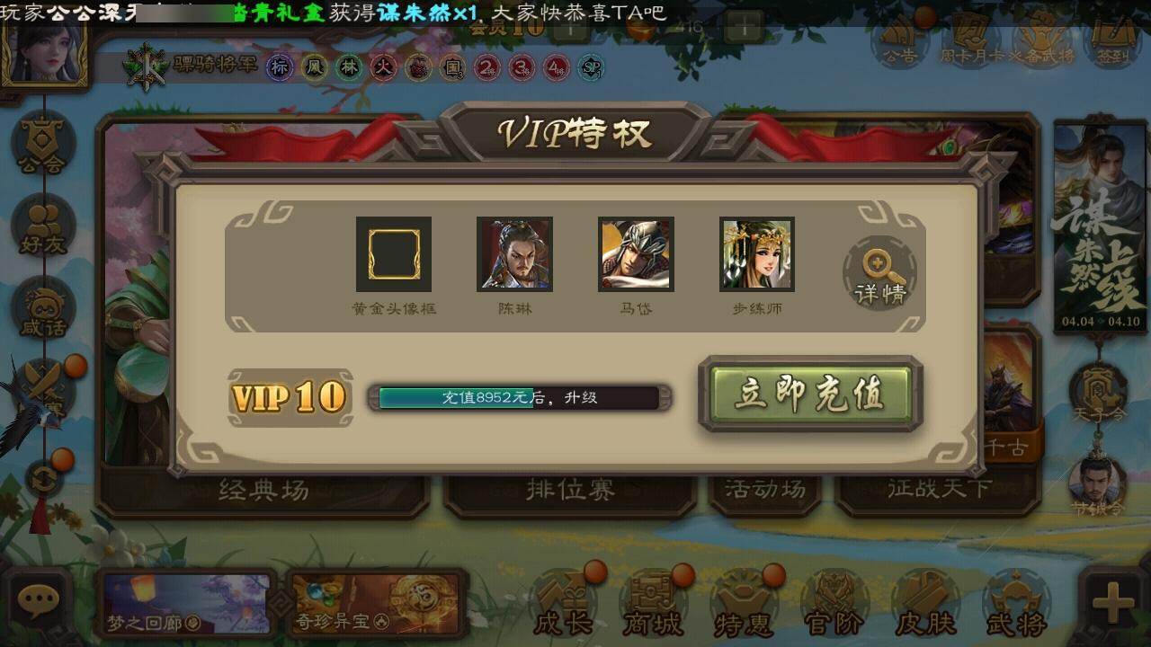 官阶:骠骑将军;VIP等级:VIP10;史诗武将数量:26;动态皮肤数量:16