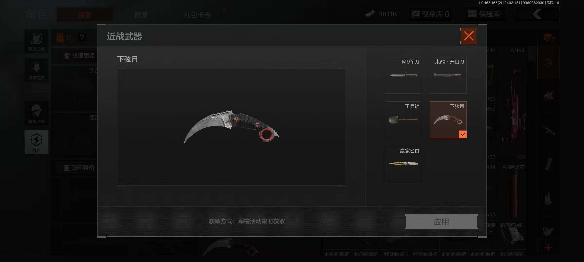【AQZ375】等级:30/段位:大师/仓库价值(百万):4811/柯恩币:14/下弦月/赢家匕首/工兵铲/来战开山刀
