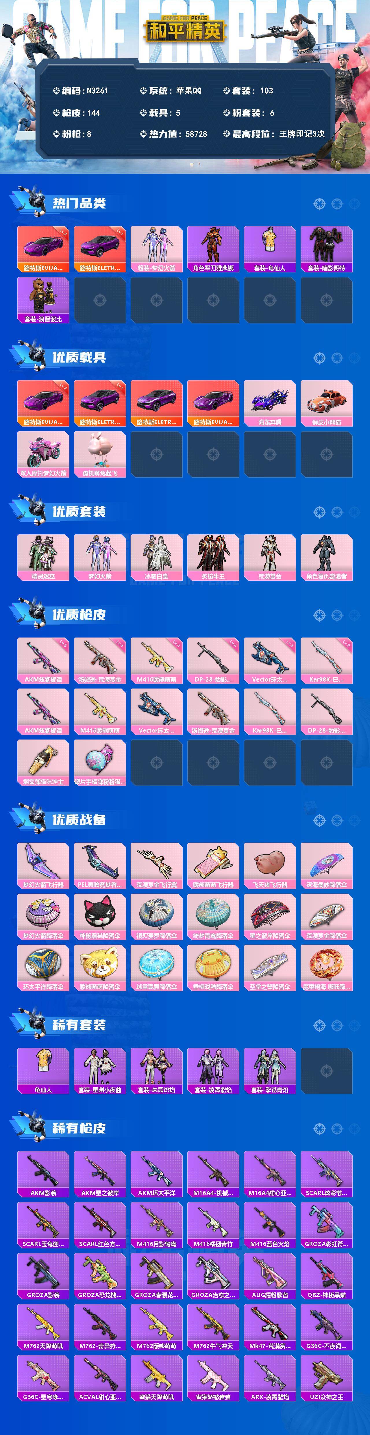 苹果 手Q-6粉装-8特效枪-5载具-6粉色飞行器-58728热力值-3王牌印记-103套装-144枪皮