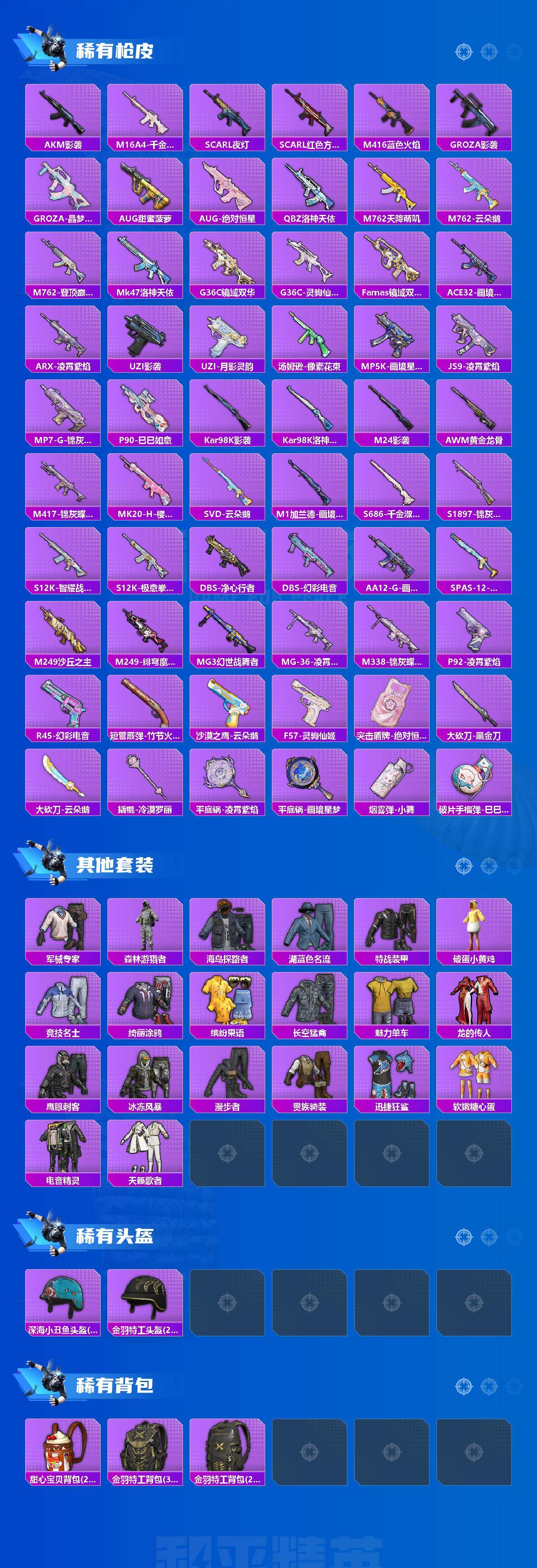 【粉色枪皮等级】:UMP45-萌骑冒险(二级),P90-沙丘之主(三级),Kar98K-巳巳如意(五级),Mk14-福马献瑞(五级),SVD-月影灵韵(七级),DP-28-豹影疾电(五级),MG3-洛神天依(四级)