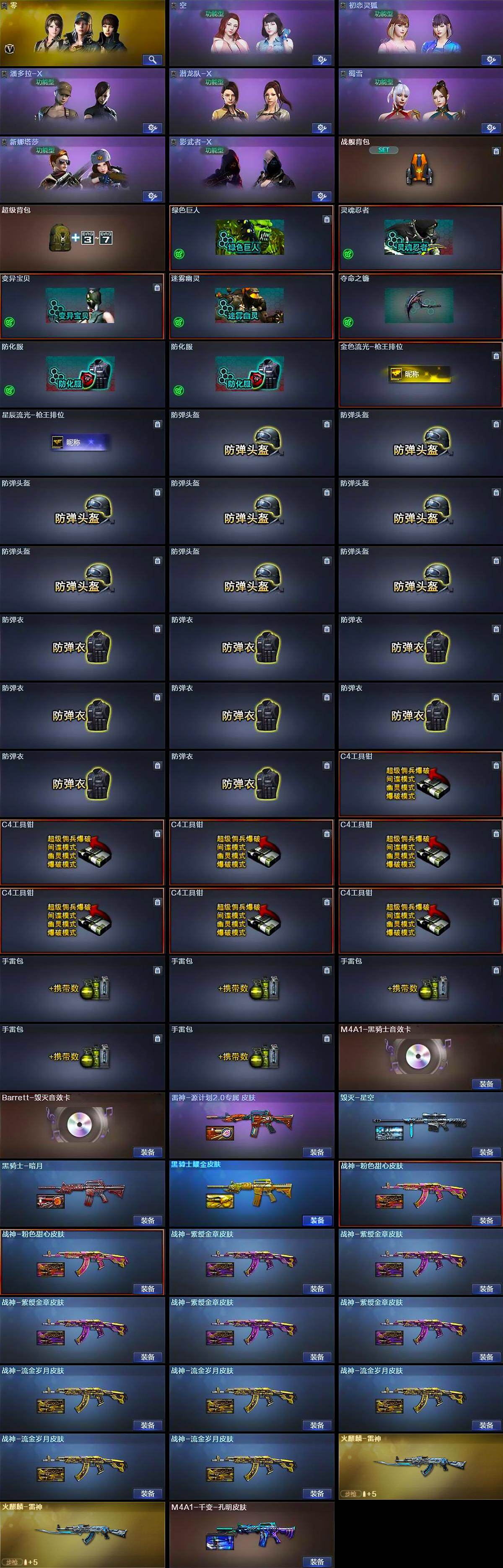 河南一区-58V-2王者武器数-2炫金武器数【热门武器】:死亡之眼,M4A1-黑骑士*2,RPK-盘龙*4,加特林-炼狱,沙鹰-修罗*2【王者炫金武器】:王者之翼,王者之锋,炫金骑士,炫金修罗【音效卡】:M4A1-黑骑士音效卡,Barrett-毁灭音效卡【皮肤】:雷神-源计划2.0专属 皮肤,火麒麟-雷神*2,毁灭-星空,毁灭-英雄计划 皮肤,M4A1-千变-孔明皮肤,黑骑士-暗月,黑骑士耀金皮肤,战神-粉色甜心皮肤*2,战神-紫绶金章皮肤*5,战神-流金岁月皮肤*5【角色】:零,空,初恋灵狐,