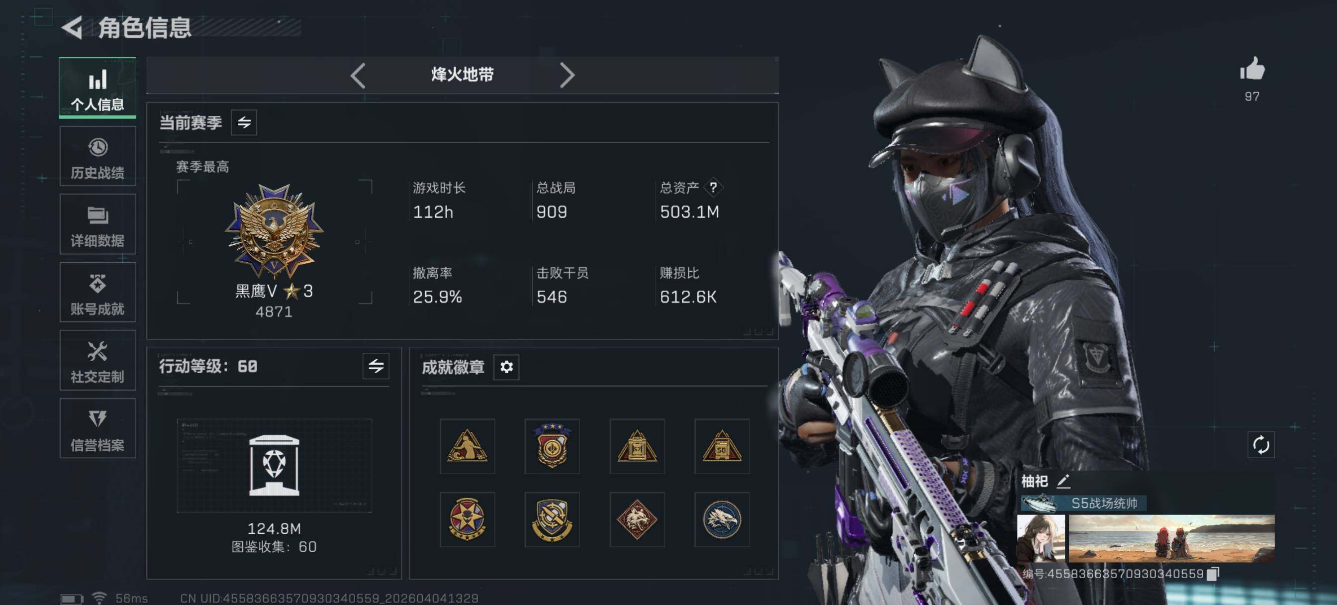 【特价出售/店主推荐】503m总资产-118146k哈夫币-60烽火等级-钻石-50战场等级-军士长