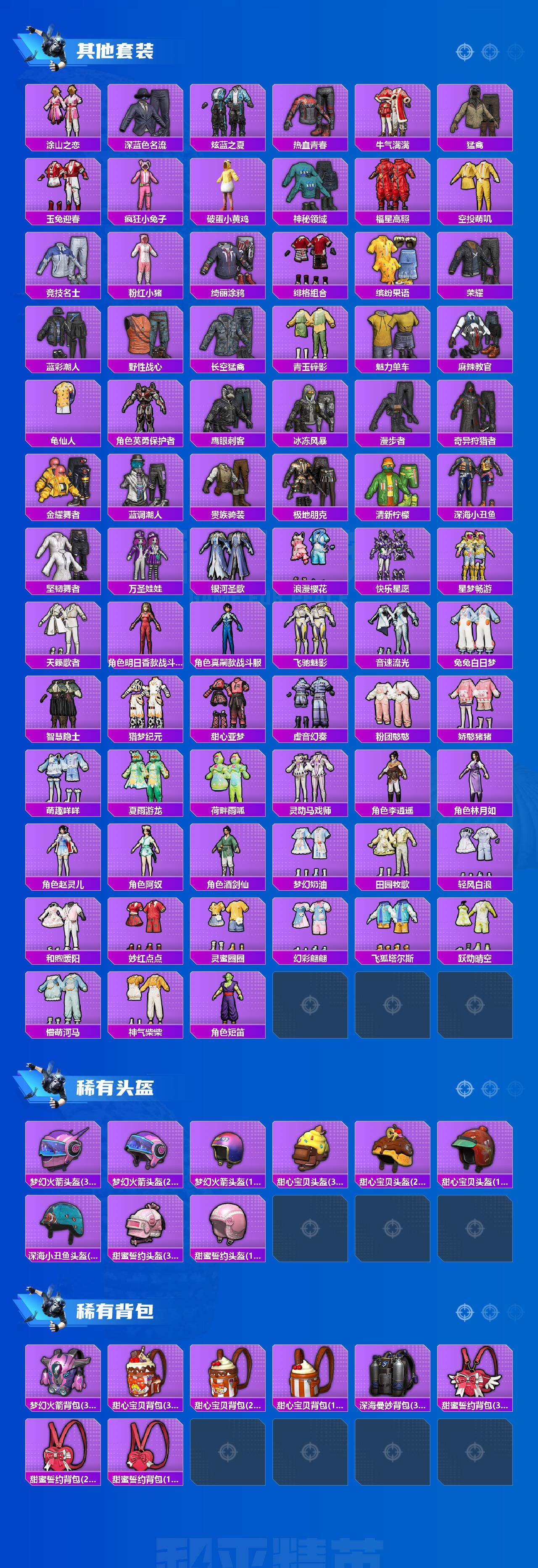 【粉色套装】:粉装-甜心巧克力,粉装-宝贝奶油派,粉装-天使彩虹糖,粉装-梦幻火箭,粉装-放客神游,粉装-冰霜白皇,粉装-炙焰红王,粉装-星之彼岸,角色-零号机款机体服,粉装-妙趣可丽,角色-复仇流浪者,粉装-灵感创作师,蜀山剑侠-李逍遥,女娲后裔-