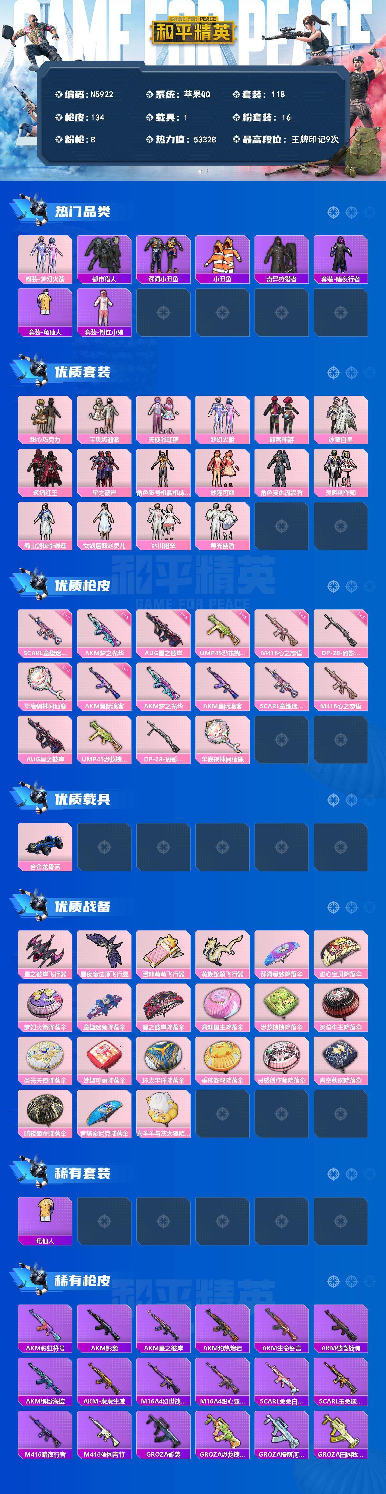 苹果 手Q-16粉装-8特效枪-1载具-4粉色飞行器-53328热力值-9王牌印记-118套装-134枪皮