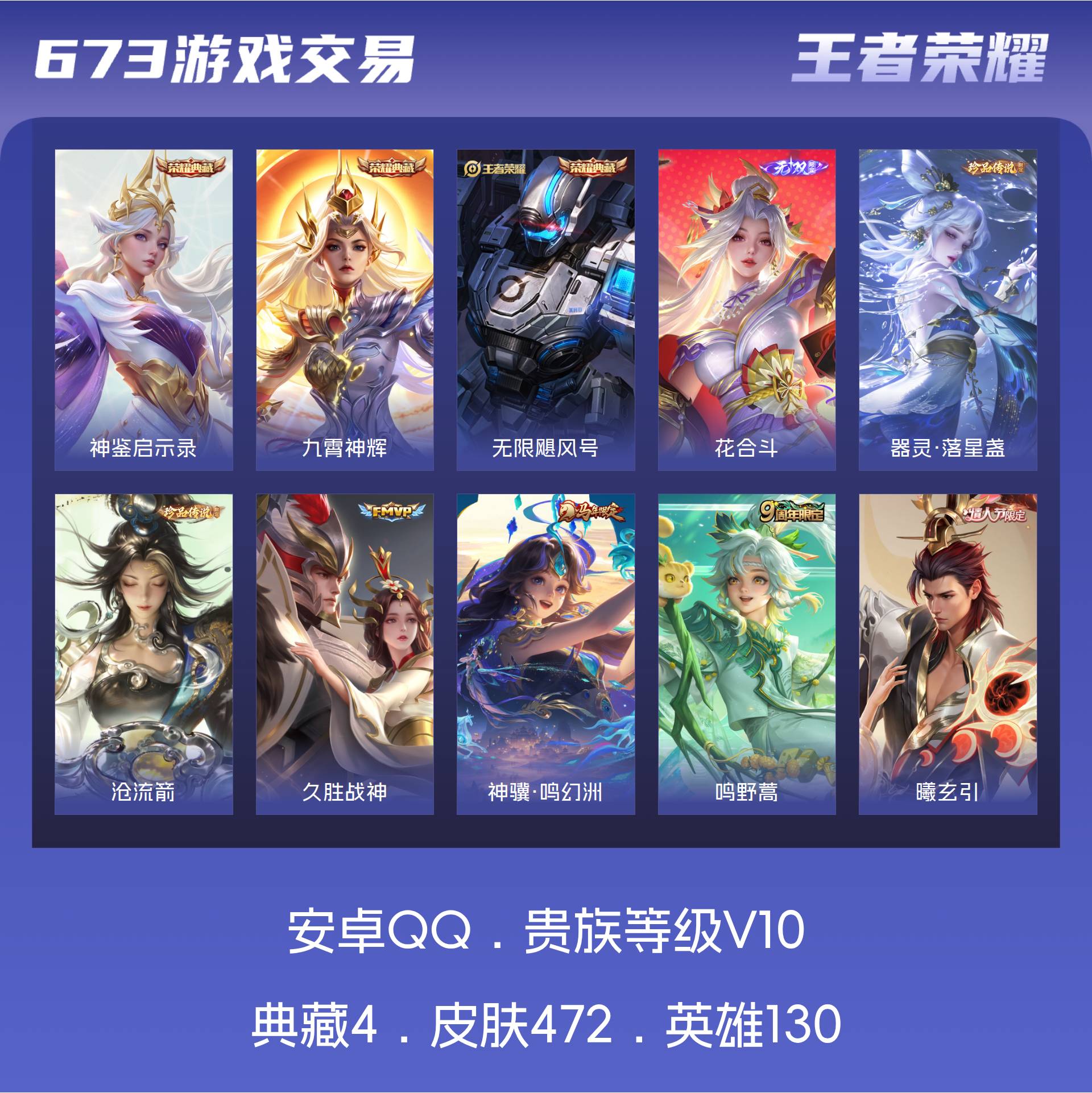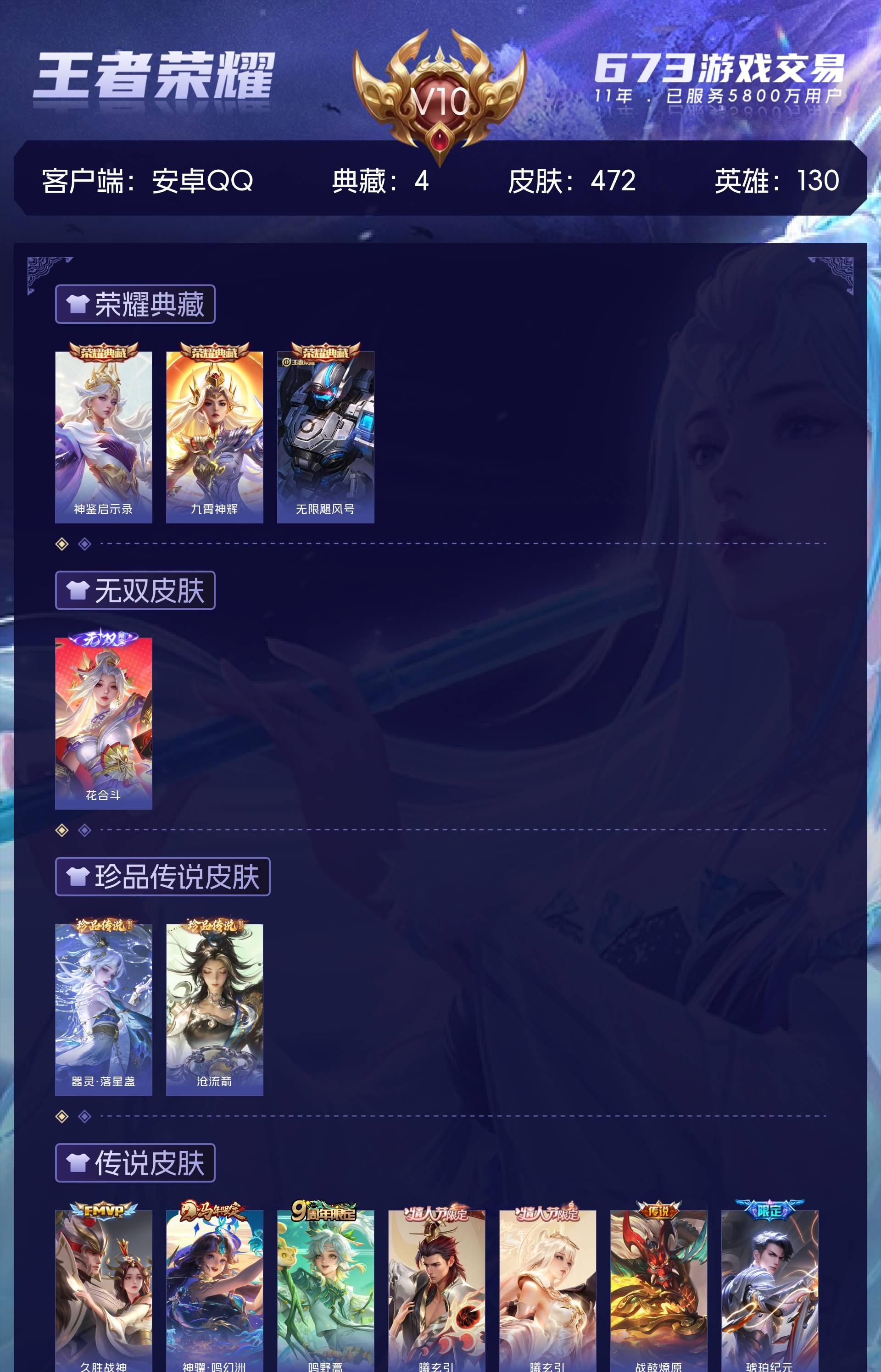 V10 皮肤472 英雄130 永恒钻石 荣耀典藏4 无双皮肤1 珍品传说2 星传说5 传说69