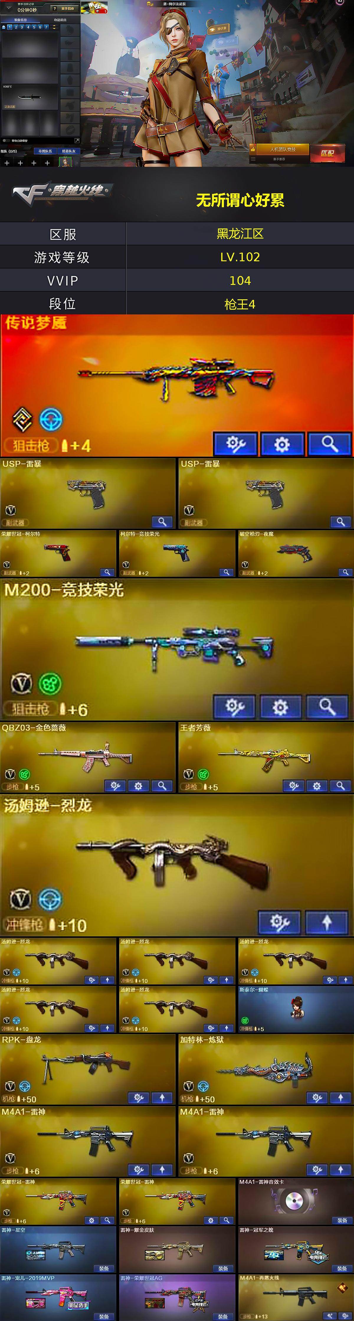 黑龙江区-110V-2王者武器数-0炫金武器数【传说武器】:传说梦魇【热门武器】:传说梦魇,QBZ03-金色蔷薇,HK417-朱雀,M200-竞技荣光,死亡之眼,荣耀世冠-火麒麟,荣耀世冠-雷神*2,QBZ03-街机,荣耀世冠-柯尔特,C.A.T,汤姆逊-烈龙*6,RPK-盘龙,加特林-炼狱,斯泰尔-蝴蝶,USP-雷暴*2,沙鹰-修罗*2,荣耀世冠-龙啸【音效卡】:修罗-云海游龙音效卡,屠龙-云海游龙音效卡,AK47-火麒麟音效卡,M4A1-雷神音效卡,Barrett-毁灭音效卡,炼狱-百战金芒