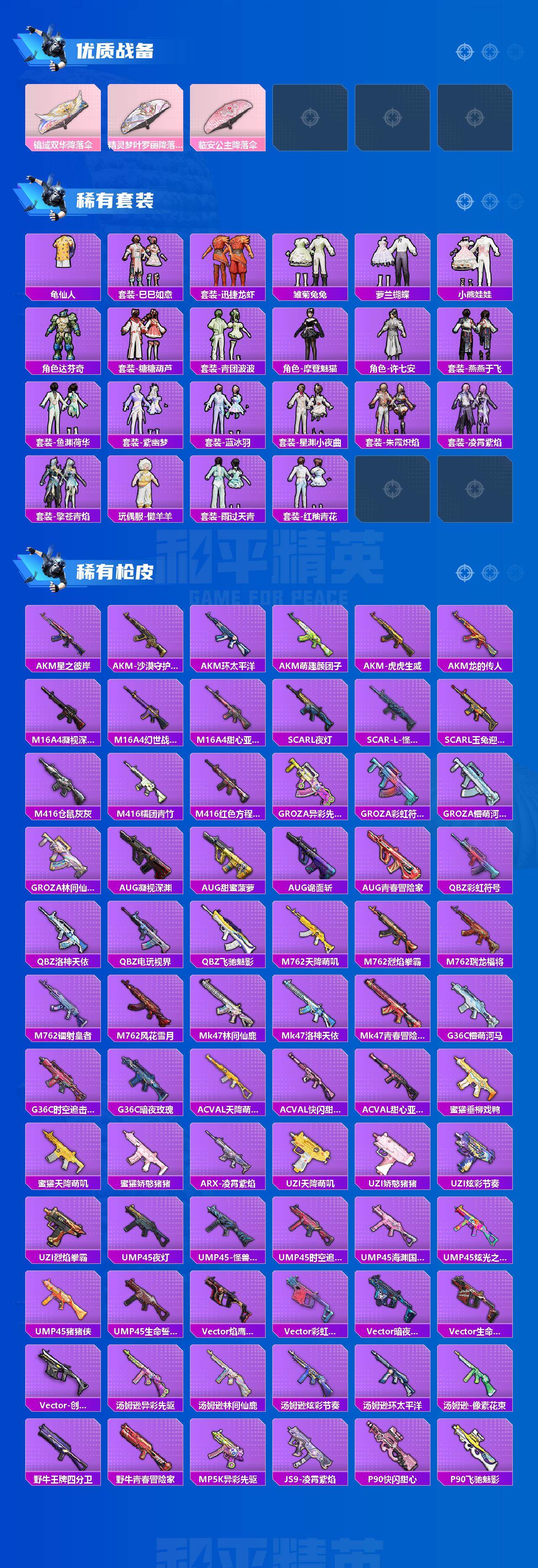 【特价出售/店主推荐】安卓 手Q-21粉装-17特效枪-3载具-7粉色飞行器-101120热力值-8王牌印记-201套装-271枪皮【热门品类】:粉装-梦幻火箭,套装-奇异狩猎者,角色-军刀雅典娜,套装-沙漠守护者,套装-龟仙人,套装-暗影哥特,角色-8号机,角色-Mark.06【粉色套装】:粉装-梦幻火箭,粉装-星之彼岸,粉装-馨动时刻,粉装-显圣真君,粉装-暗夜玫瑰,粉装-林间仙鹿,粉装-彩虹鹿灵,粉装-山涧鹿灵,角色-洛天依,粉装-沙场疾风,角色-零号机款机体服,角色-初号机款机体服,角色